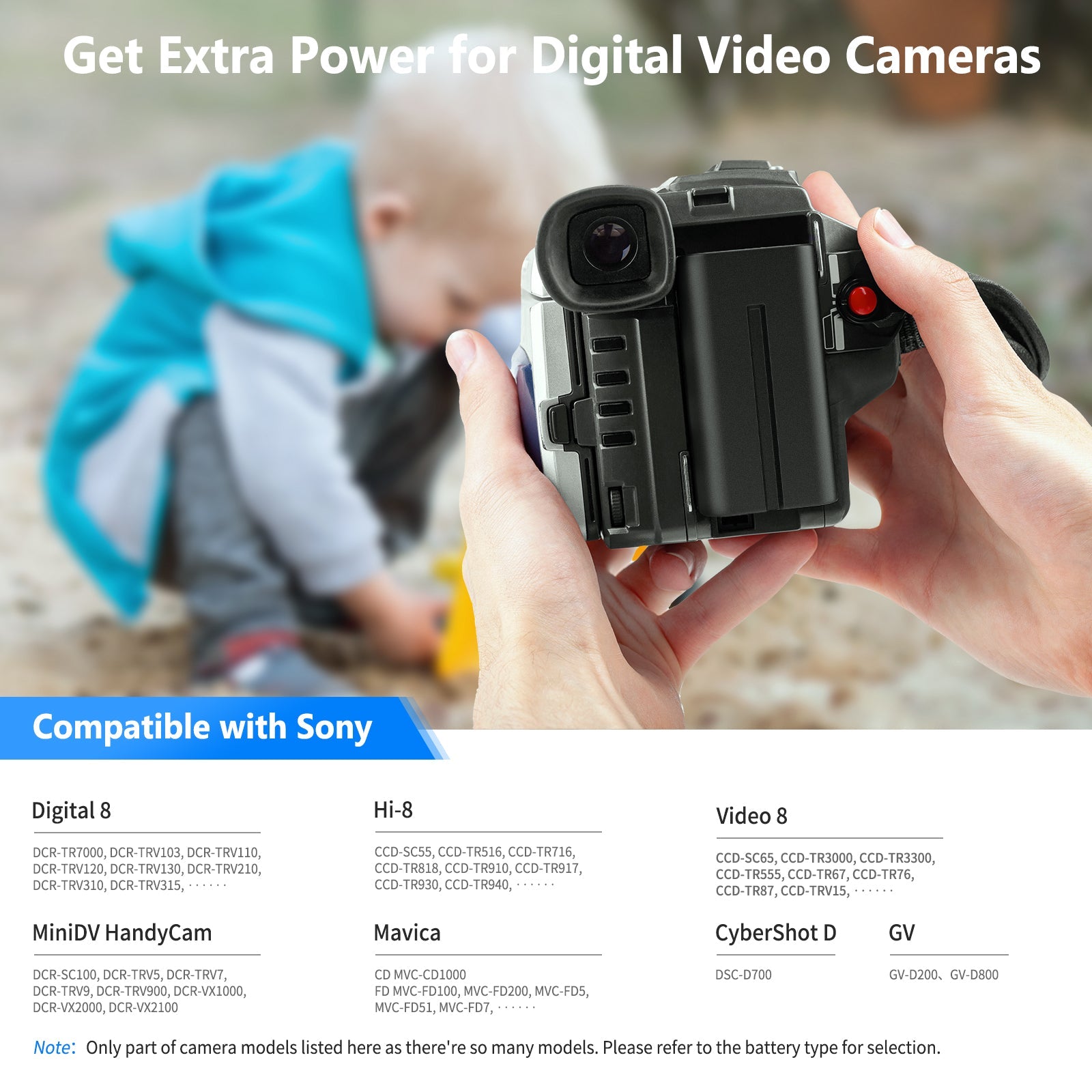 • Meilleure alternative à la batterie d'origine Sony NP-F330, NP-F530, NP-F550, NP-F570, NP-F730, NP-F750, NP-F930, NP-F950.