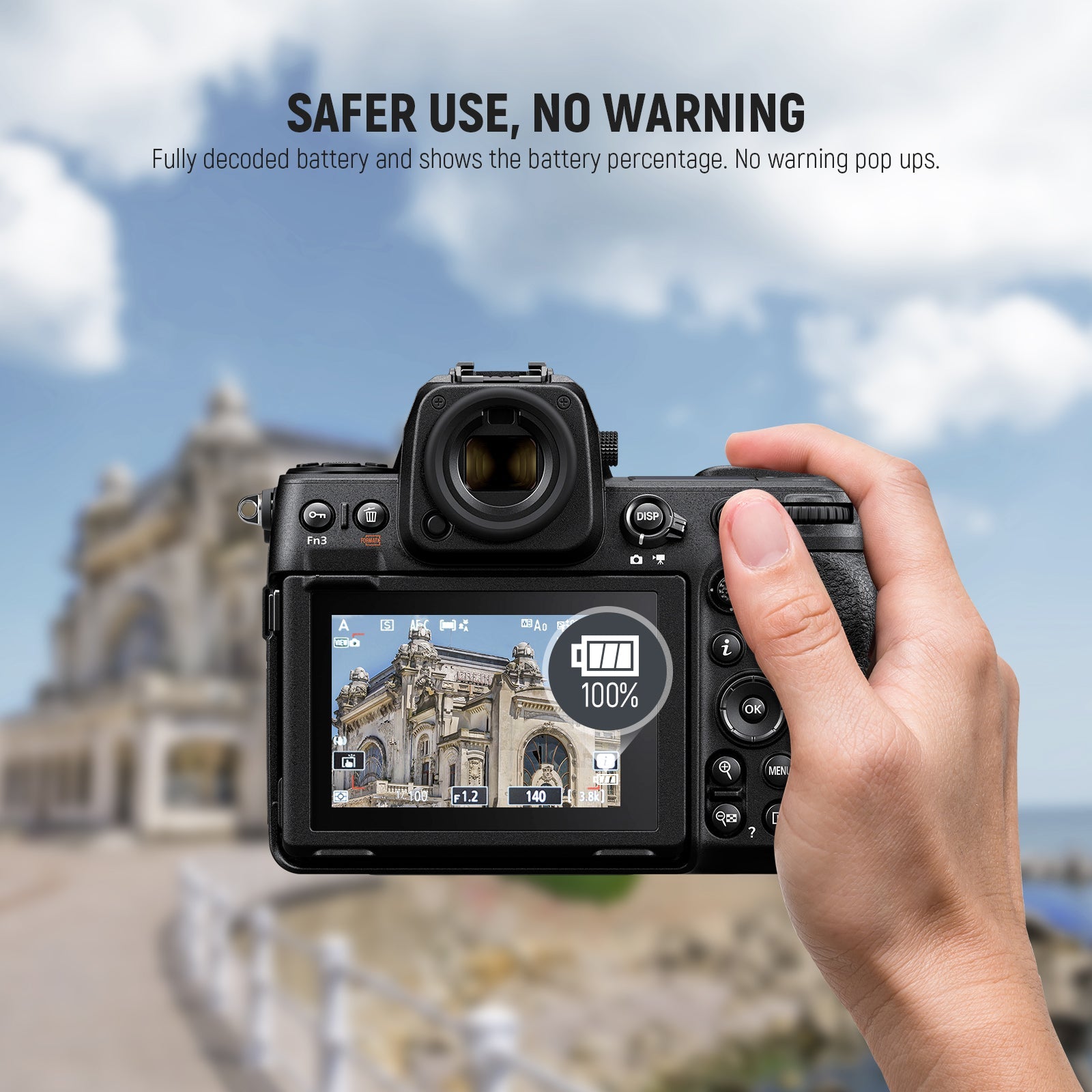 - Entièrement décodée pour une utilisation plus sûre - Cette batterie est entièrement décodée. Elle n'affichera aucun message d'avertissement sur l'écran de votre appareil photo et l'icône d'état de la batterie sera identique à celle des batteries d'origine.