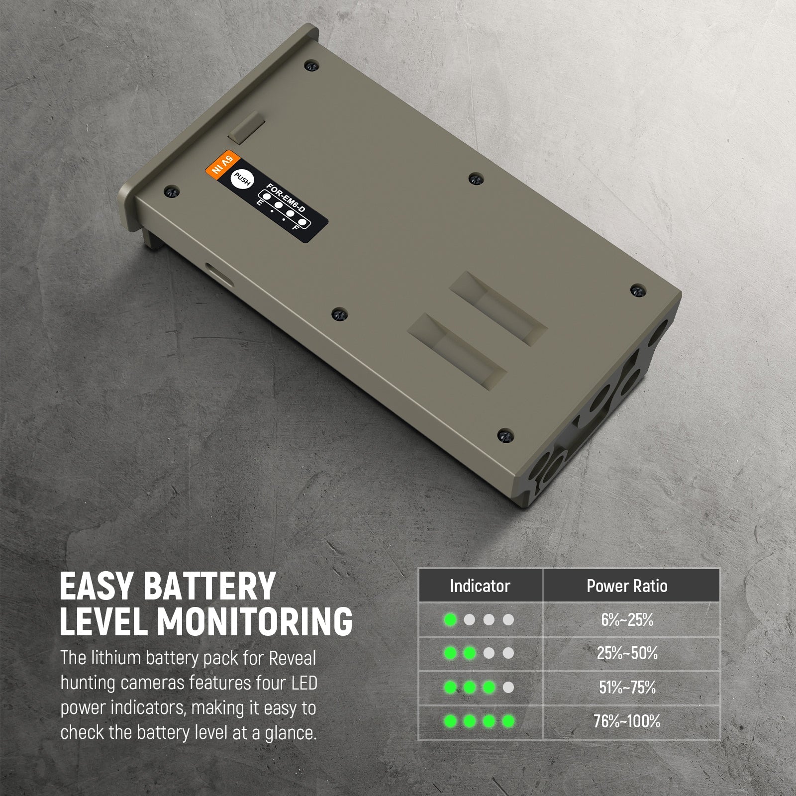 • Contrôle facile du niveau de batterie : la batterie au lithium des caméras de chasse Reveal est équipée de quatre indicateurs LED, permettant de vérifier facilement le niveau de batterie en un coup d’œil. Vous êtes ainsi toujours informé de la charge restante et ne risquez jamais d’être pris au dépourvu lors de vos aventures en plein air.
