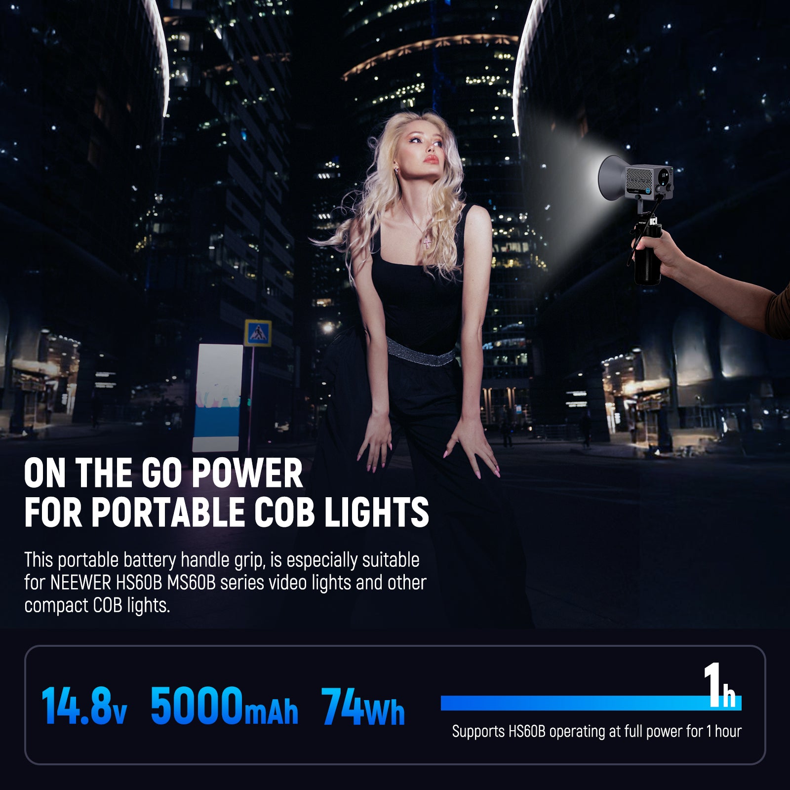 - Batterie portable pour éclairage COB - Cette batterie portable, dotée d'une poignée ergonomique, est particulièrement adaptée aux éclairages vidéo NEEWER des séries HS60B et MS60B, ainsi qu'à d'autres éclairages COB compacts. Elle offre une solution plus légère pour l'éclairage vidéo portatif sur batterie. Sa grande capacité de 5 000 mAh (74 Wh) garantit une alimentation fiable et stable pour les prises de vue prolongées (jusqu'à 1 heure d'autonomie avec la HS60B à pleine puissance). Son design à rayures assure une prise en main confortable et prolongée.