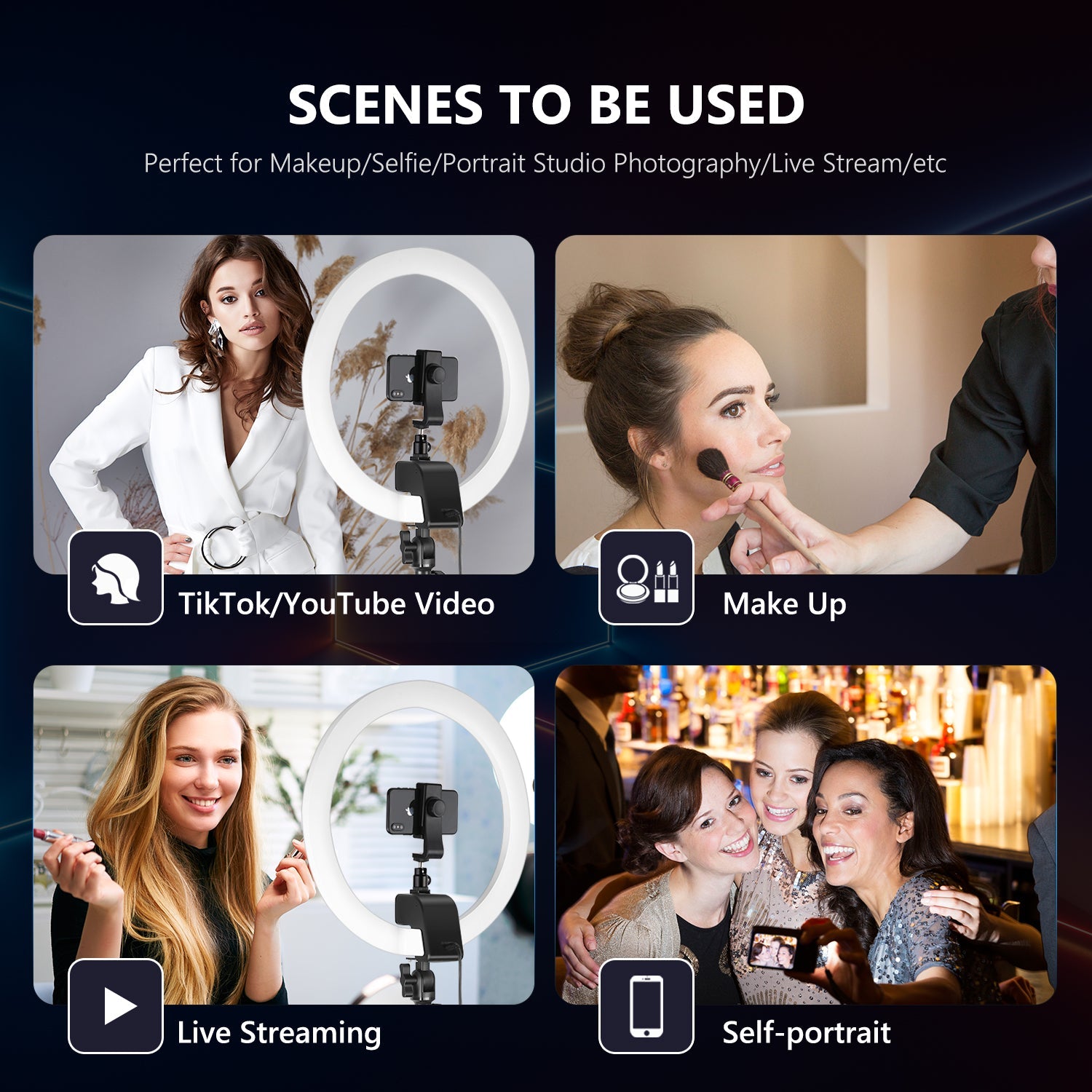 - SUPPORT POUR SMARTPHONE ET PIED D'ÉCLAIRAGE INCLUS - Un adaptateur pour griffe flash est compatible avec la plupart des appareils photo reflex numériques et un support pour smartphone est inclus pour la plupart des smartphones ; idéal pour le maquillage, l'éclairage de selfies, la photographie de portrait en studio vidéo, les diffusions en direct, les blogueurs, les salons de coiffure, etc.
