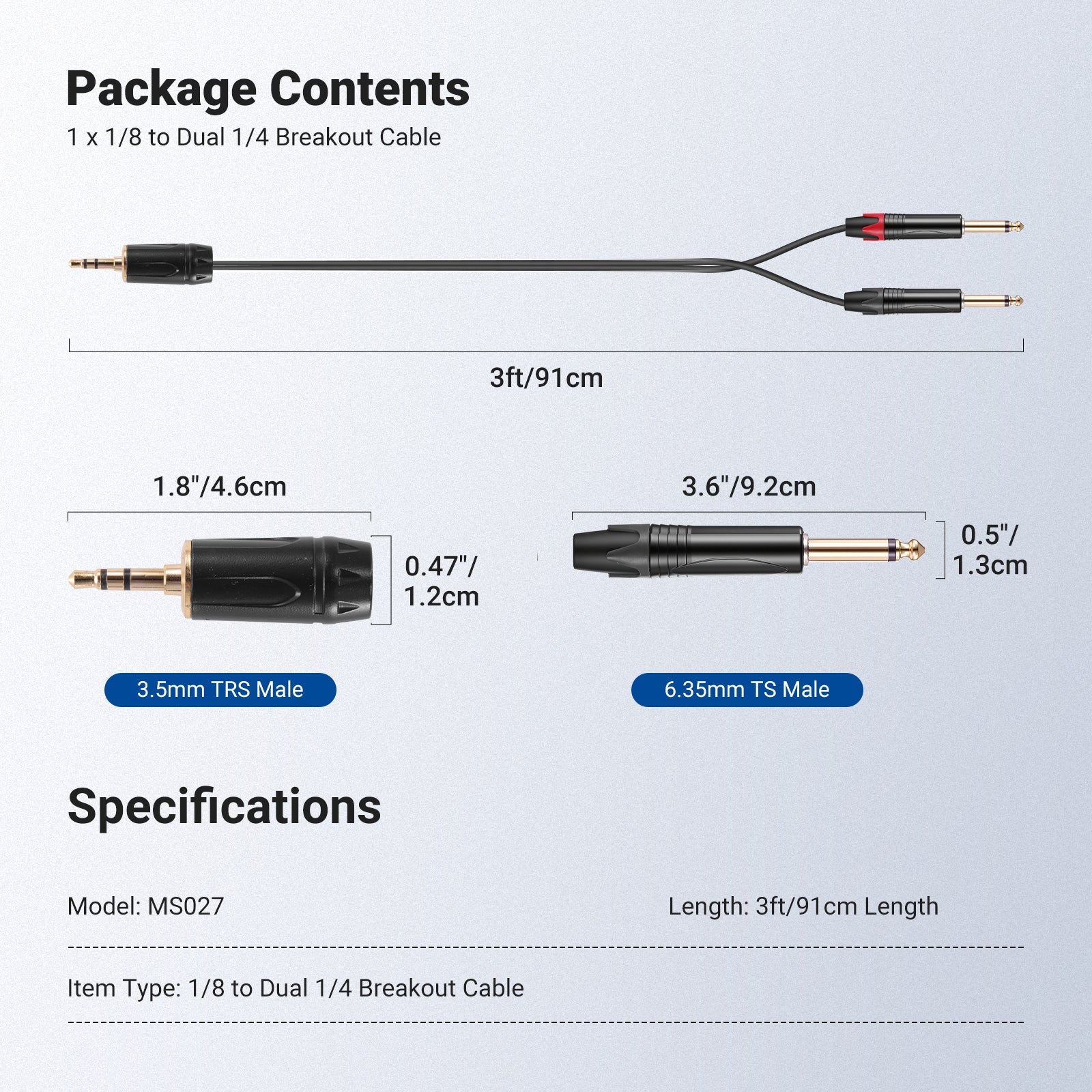 NEEWER 3.5mm 1/8 TRS to 1/4 Dual 6.35mm TS Breakout Cable