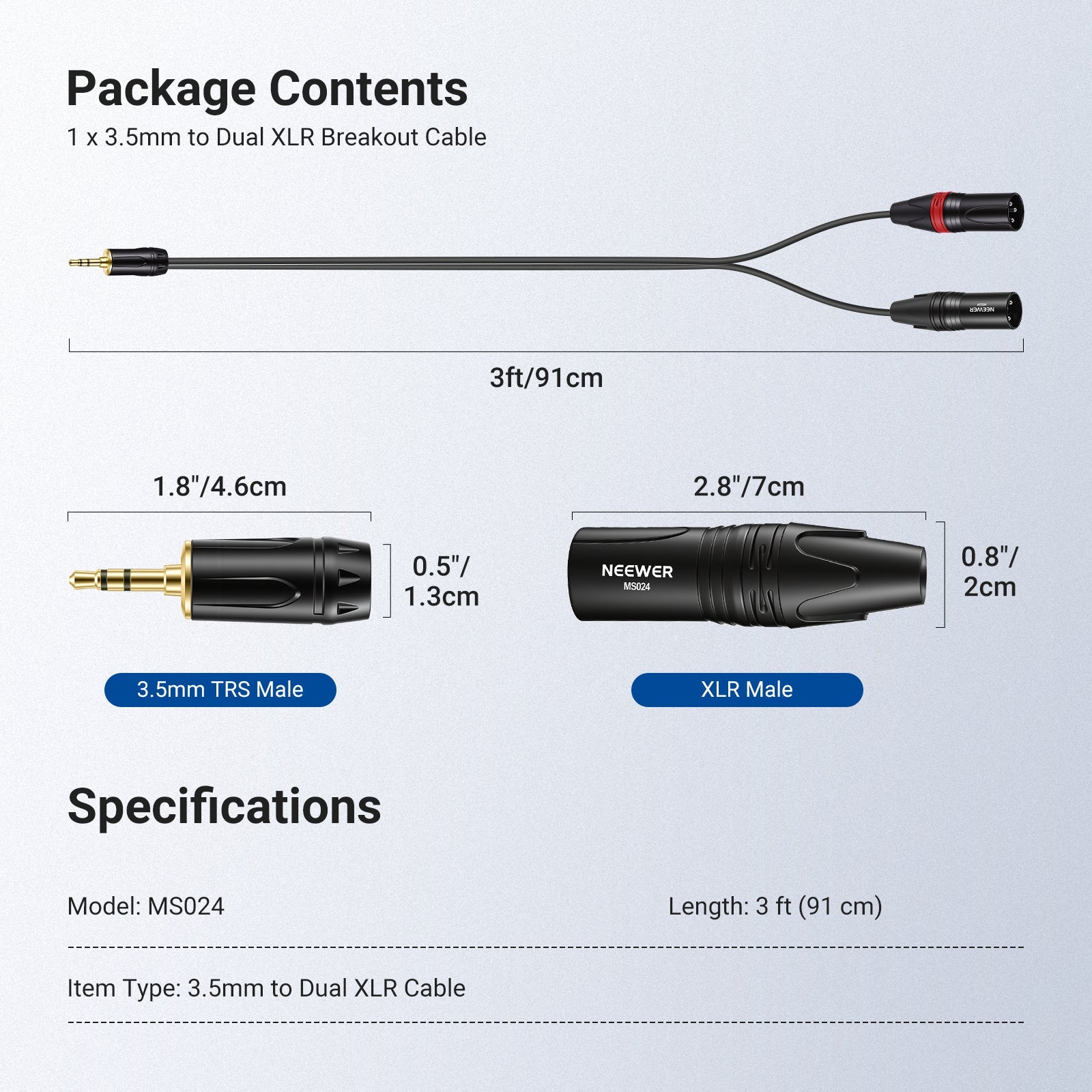 NEEWER 3.5mm 1/8 Inch TRS AUX to Dual XLR Breakout Cable