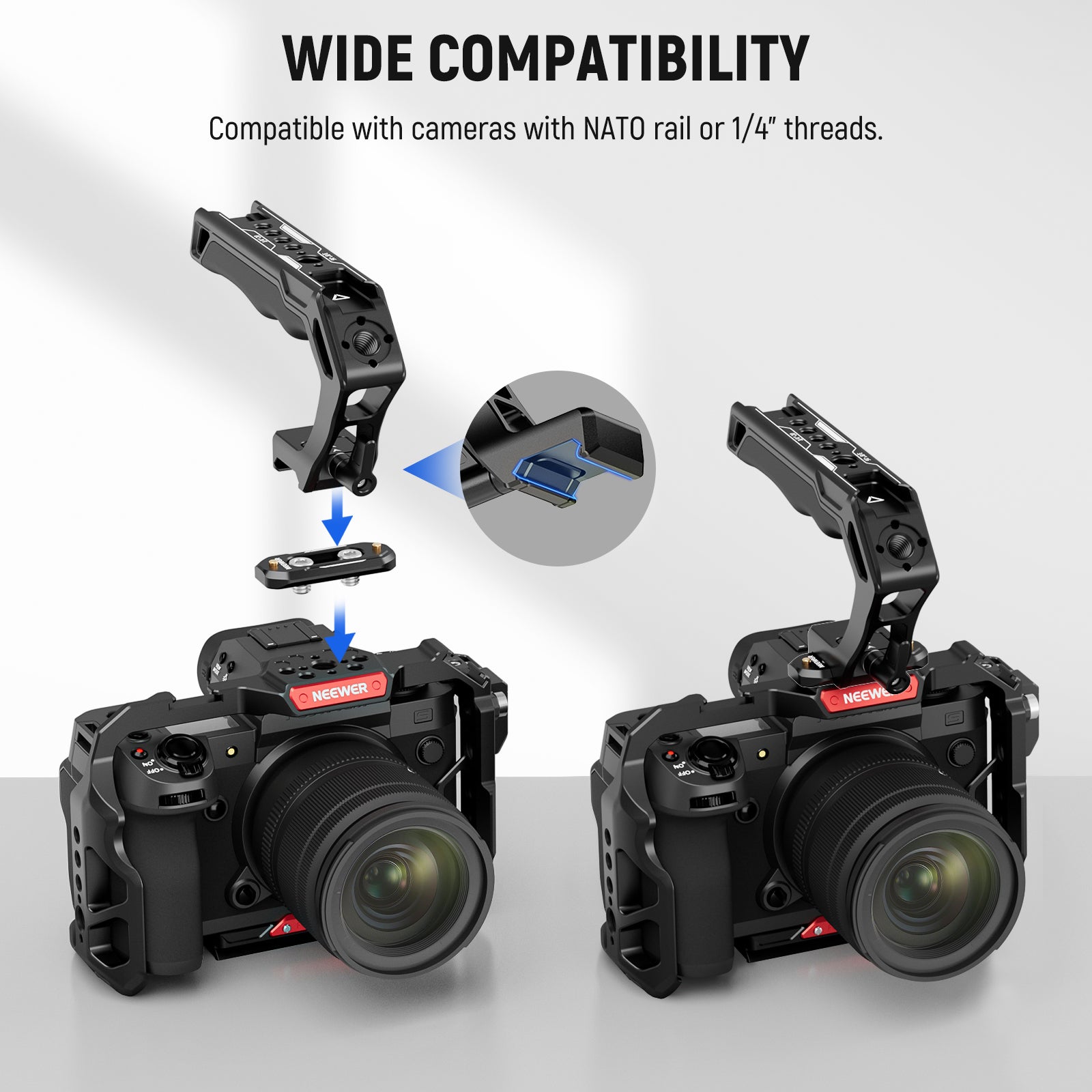 - Poignée supérieure universelle avec rail NANO 48 mm - La poignée supérieure NEEWER CA008 est compatible avec tous les rails NATO et offre un réglage libre de sa position. Le rail NATO 48 mm inclus se fixe sur une cage de caméra à l'aide de deux vis 1/4" (les rails NATO UA007 75 mm et UA022 60 mm sont vendus séparément). Il est également équipé de boutons de dégagement rapide pour une installation instantanée et une protection anti-chute, avec une capacité de charge maximale de 10 kg.