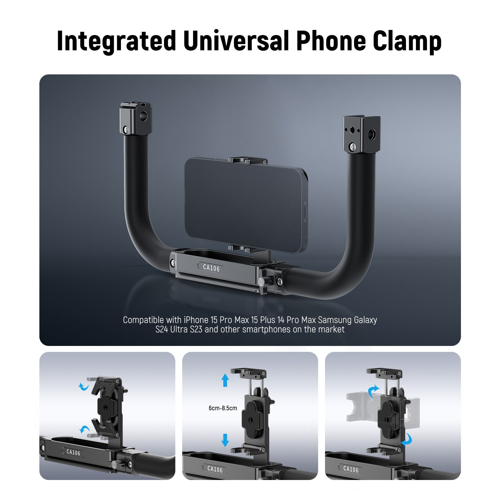 - Support universel intégré pour téléphone - Le support réglable de 60 à 85 mm est compatible avec tous les smartphones, y compris les iPhone 16, 15 Pro Max, 16, 15 Plus, 14 Pro Max, Samsung Galaxy S24 Ultra, S23 et autres. Il permet également de fixer des appareils photo hybrides compacts et des caméras de vlog.