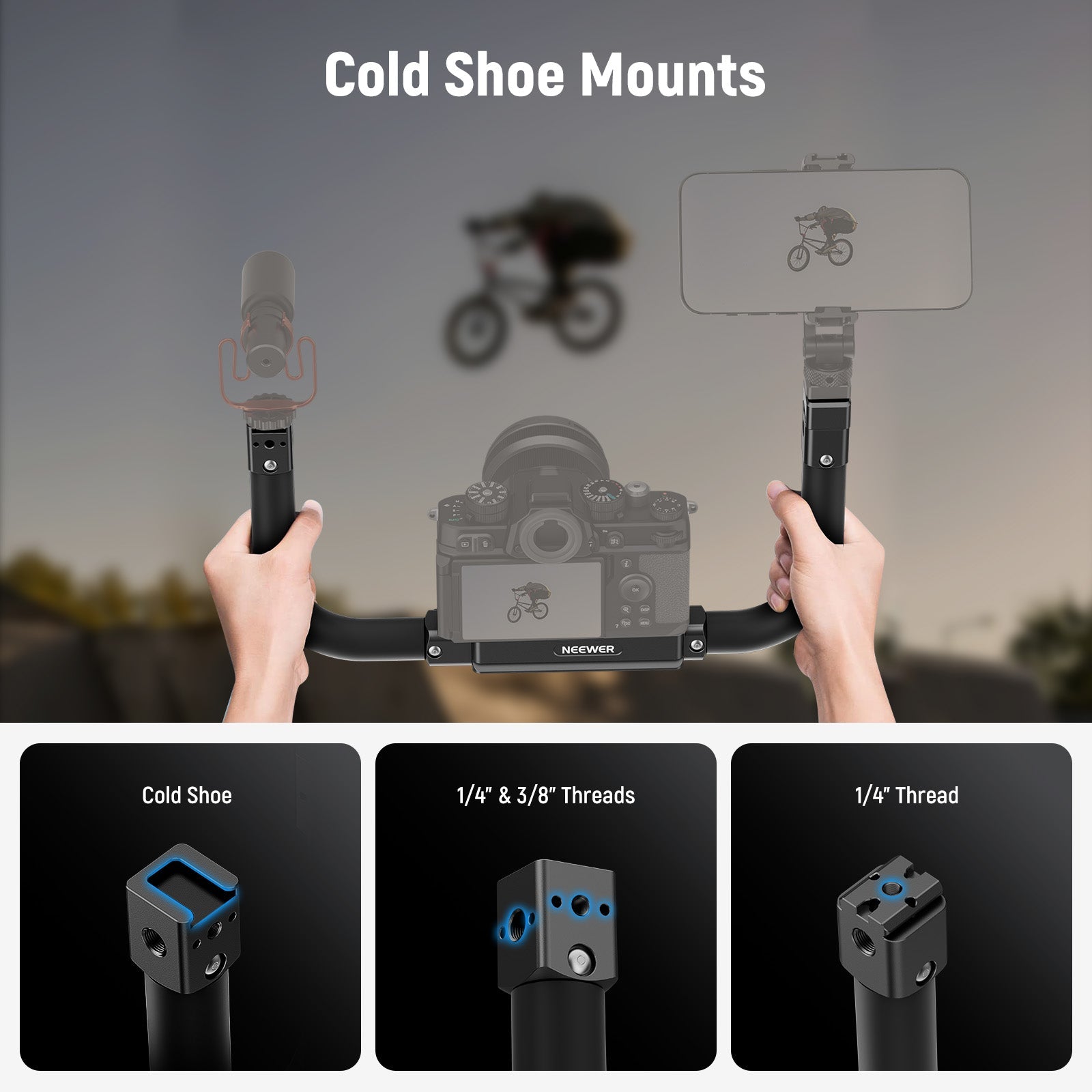- Poignées ergonomiques en forme de U - Recouvertes de mousse douce et antidérapante, les poignées en forme de U offrent une prise en main confortable et ferme pour des prises de vue stables à main levée, comme le vlogging, le tournage de films, le streaming en direct, etc.