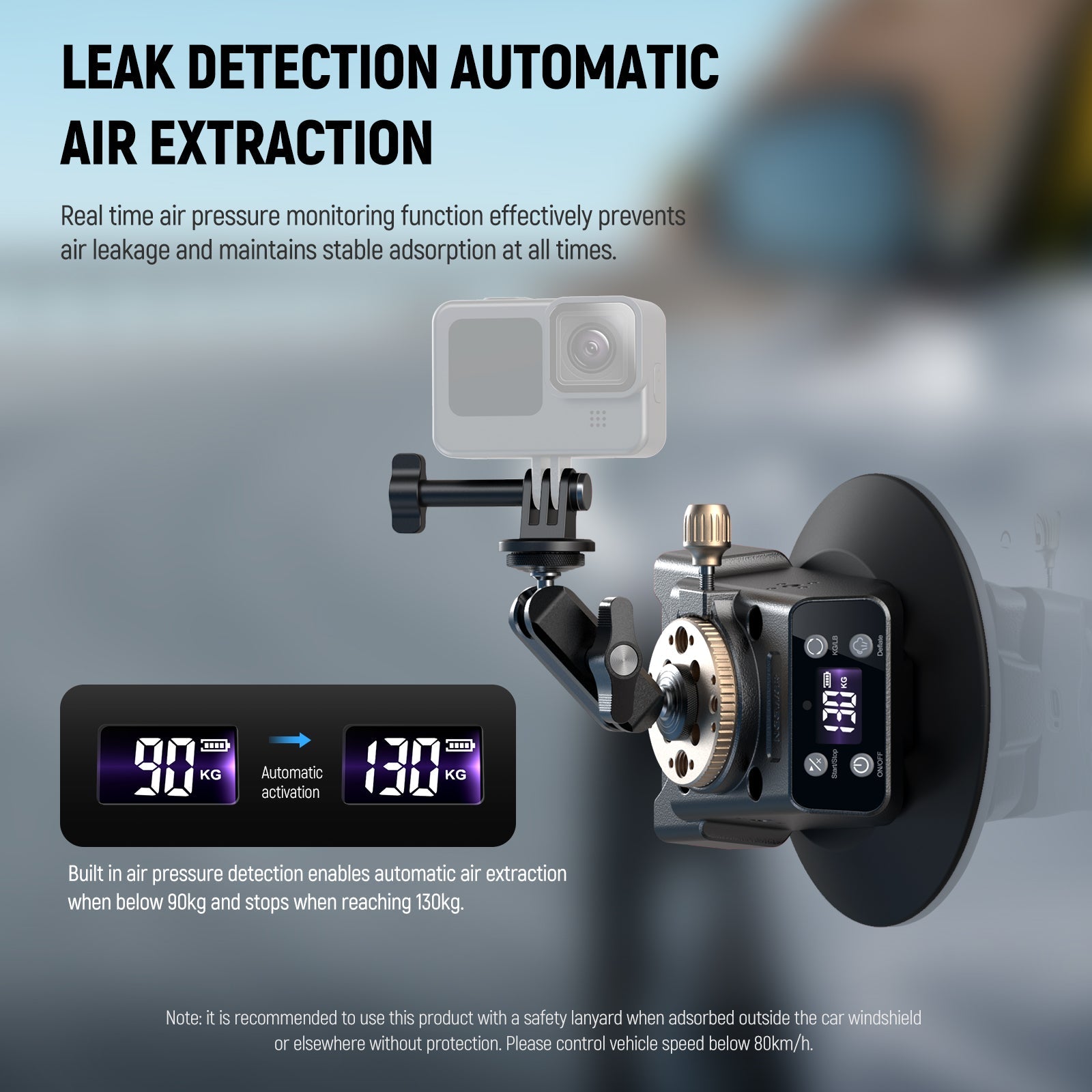 - Aspiration puissante, capacité de charge élevée - La ventouse CA017 est équipée d'une pompe à vide puissante qui adhère fermement aux surfaces lisses, planes et non poreuses telles que le verre, le carrelage et les surfaces automobiles. À une vitesse de déplacement allant jusqu'à 60 km/h, elle supporte une charge maximale de 5 kg. Remarque : La force de serrage du bras articulé à rotule varie selon les conditions d'utilisation.