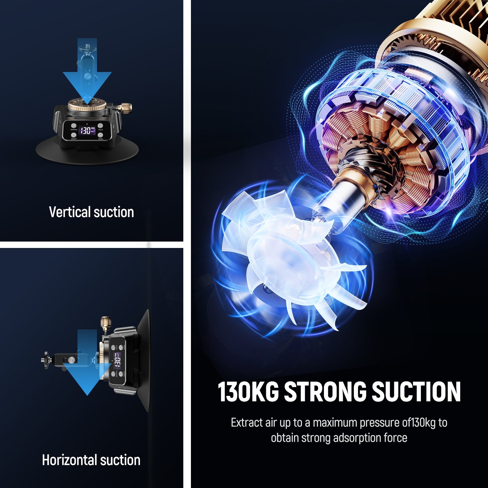 - Pompe à air automatique : si la pression de vide descend en dessous de 90 kg, la pompe se met en marche automatiquement jusqu’à ce que la pression soit rétablie. L’aspiration s’arrête à 130 kg. La ventouse reste stable et ferme en permanence. Remarque : veuillez prêter attention à la force d’aspiration affichée.