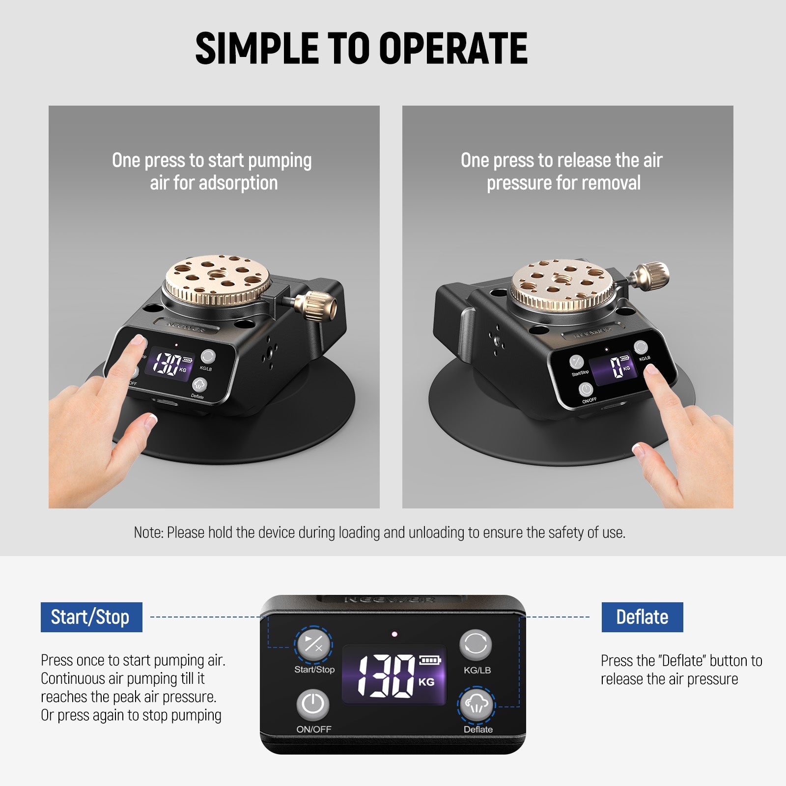 - Démarrage/dégonflage en un clic - Le NEEWER CA017 innove avec sa fixation électrique. Un seul clic suffit pour démarrer le gonflage, rapidement et précisément. Doté d'un écran numérique, il surveille intelligemment la pression interne de la ventouse. Appuyez sur le bouton « Dégonfler » pour libérer l'air. Le voyant clignote lorsque la batterie est faible. Remarque : avant de dégonfler la ventouse, retirez-la du tiroir pour éviter tout dommage en cas de chute et vérifiez régulièrement le niveau de la batterie.