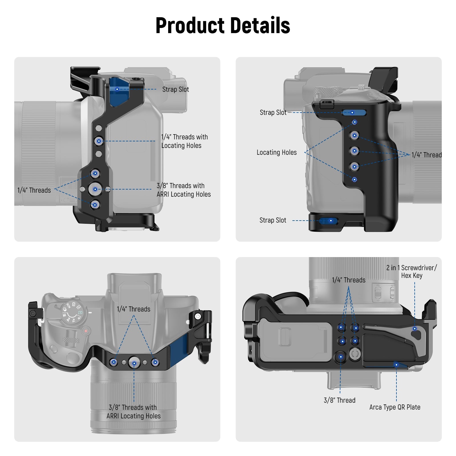 - Conception sur mesure pour EOS R50 - Cette cage métallique sur mesure est compatible avec l'appareil photo Canon EOS R50. Elle protège non seulement le boîtier, mais laisse également les ports, les boutons, le flash intégré, le compartiment de la batterie et l'écran LCD orientable entièrement accessibles. Elle offre également plusieurs points de fixation pour accessoires afin d'améliorer vos prises de vue.