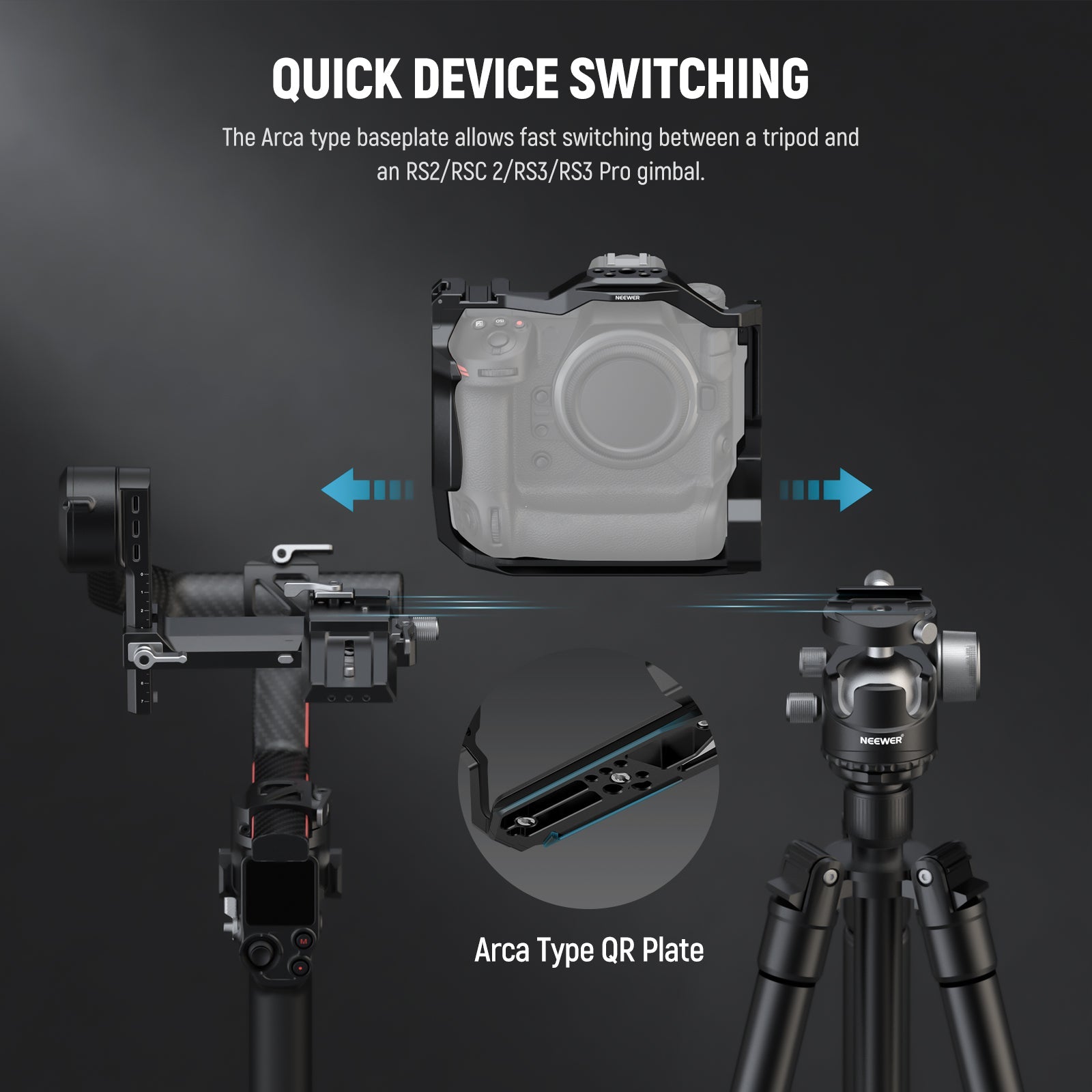- Système de transfert de caméra Arca - Doté de fixations Arca standard, ce système est compatible avec les nacelles DJI RS4, RS4 PRO, RS3, RS3 PRO et RS2, ainsi qu'avec une large gamme de têtes de trépied, permettant un transfert de caméra fluide selon vos besoins.