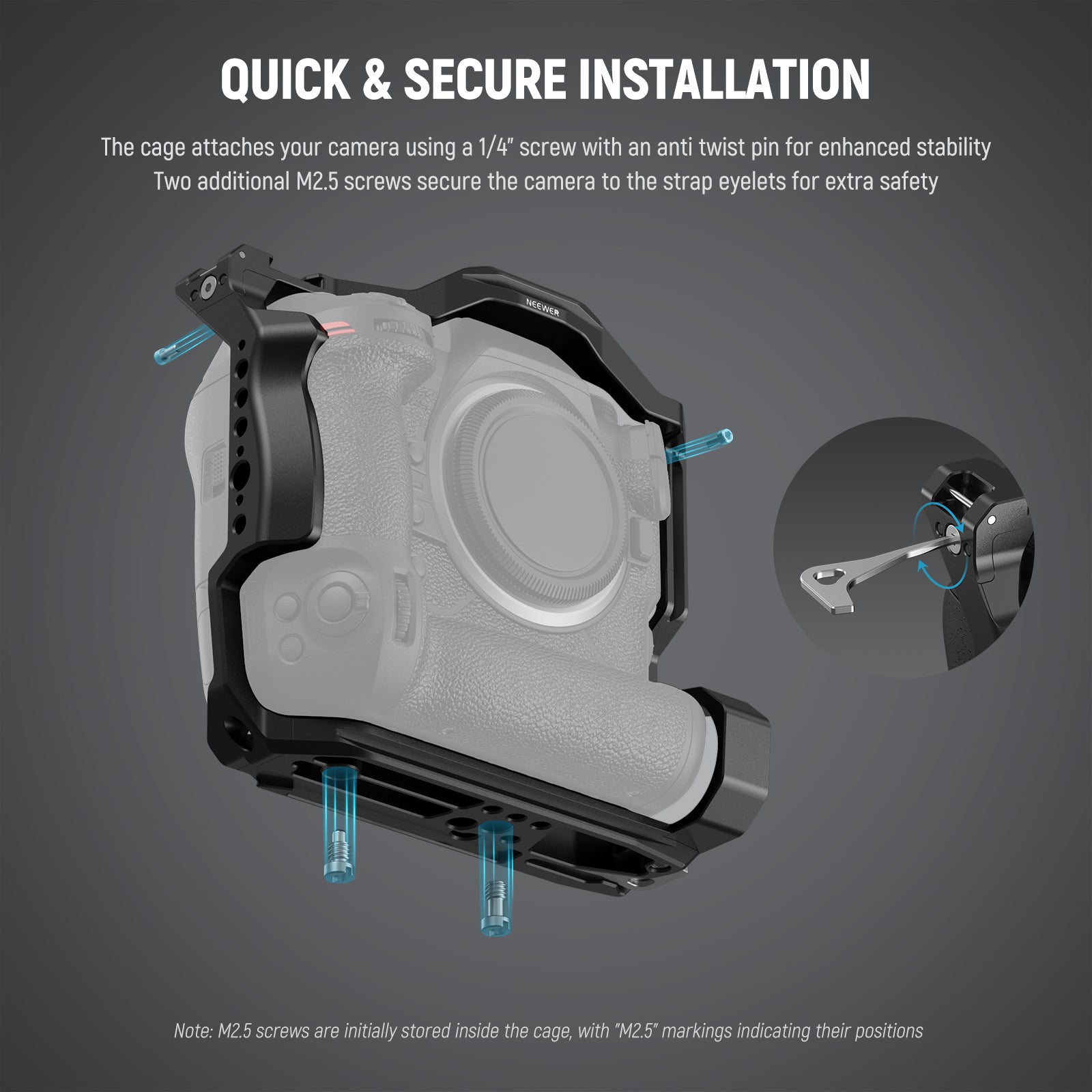 - Installation rapide et sécurisée : la cage fixe votre appareil photo à l’aide d’une vis 1/4" avec goupille anti-rotation pour une stabilité accrue. Deux vis M2.5 supplémentaires fixent l’appareil photo aux œillets de la sangle pour plus de sécurité. Remarque : les vis M2.5 sont initialement rangées à l’intérieur de la cage, avec le marquage « M2.5 » indiquant leur emplacement.