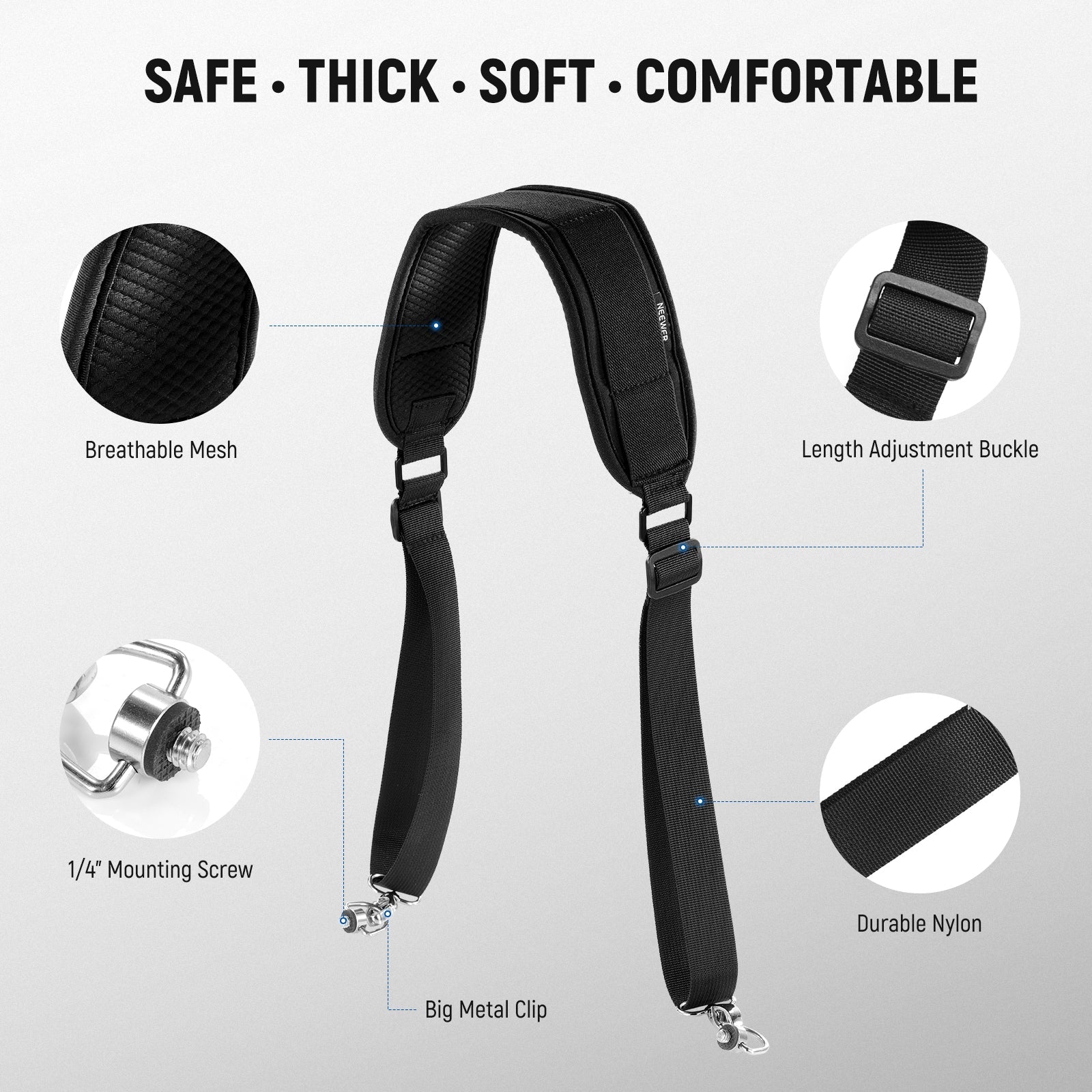 - Coussinet d'épaule doux et confortable - Le coussinet d'épaule doux et respirant répartit uniformément le poids pour réduire les tensions musculaires et éviter les douleurs aux épaules. De plus, il améliore la stabilité et empêche la bretelle de glisser lors des tournages en déplacement.