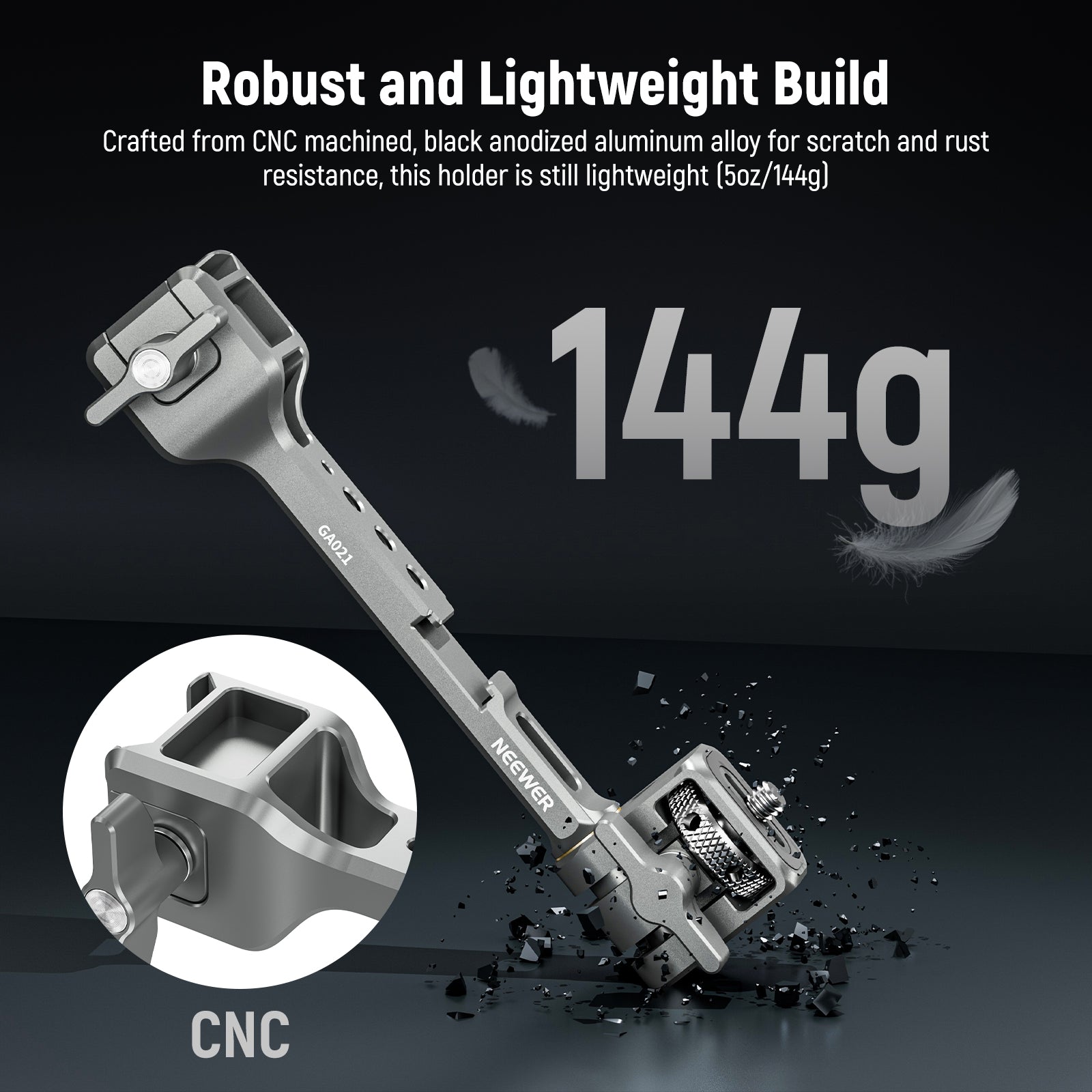 - Construction robuste et légère - Fabriqué en alliage d'aluminium anodisé noir usiné CNC pour une résistance optimale aux rayures et à la rouille, ce support reste léger (144 g), idéal pour la création en extérieur, même dans les environnements les plus complexes.