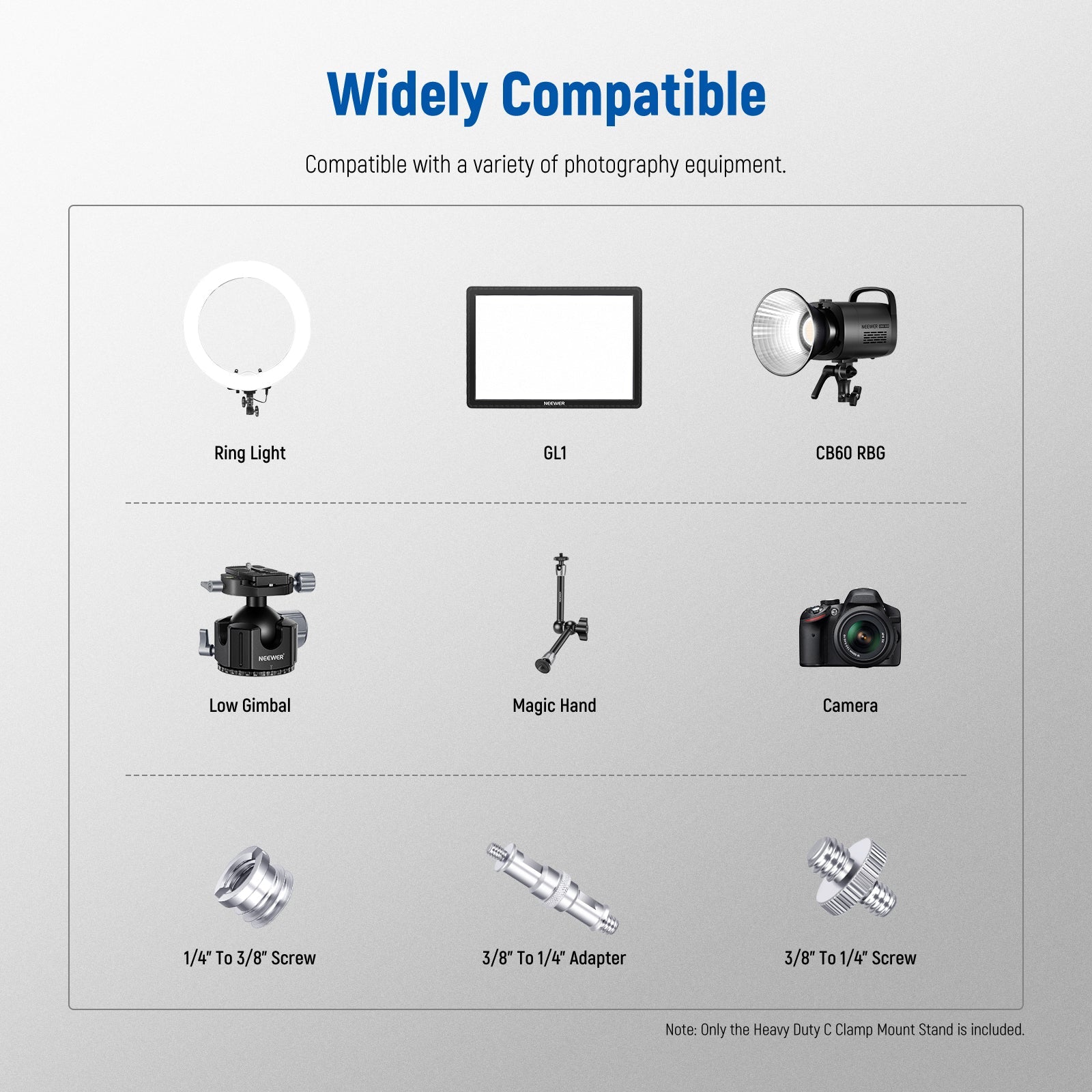- Compatibilité étendue : la colonne de montage se fixe à la pince en C à l’aide de trois vis M4. Son filetage 1/4" est compatible avec les appareils photo reflex numériques, les appareils photo hybrides, les caméras d’action, les éclairages vidéo LED, les anneaux lumineux, les monolights et de nombreux autres dispositifs. Plusieurs pas de vis 1/4" et 3/8" permettent de connecter des bras articulés, des pinces de fixation, des rallonges et autres supports.