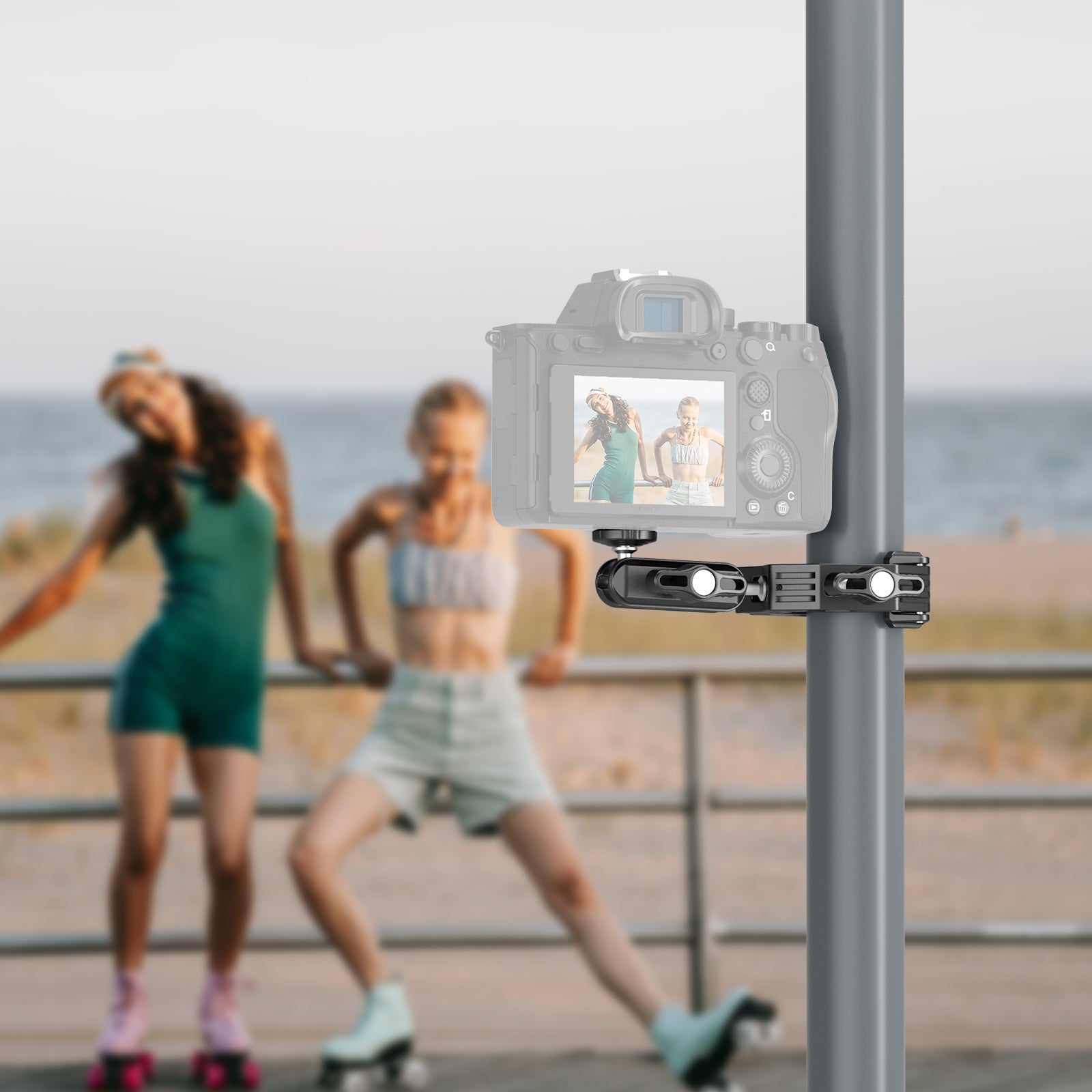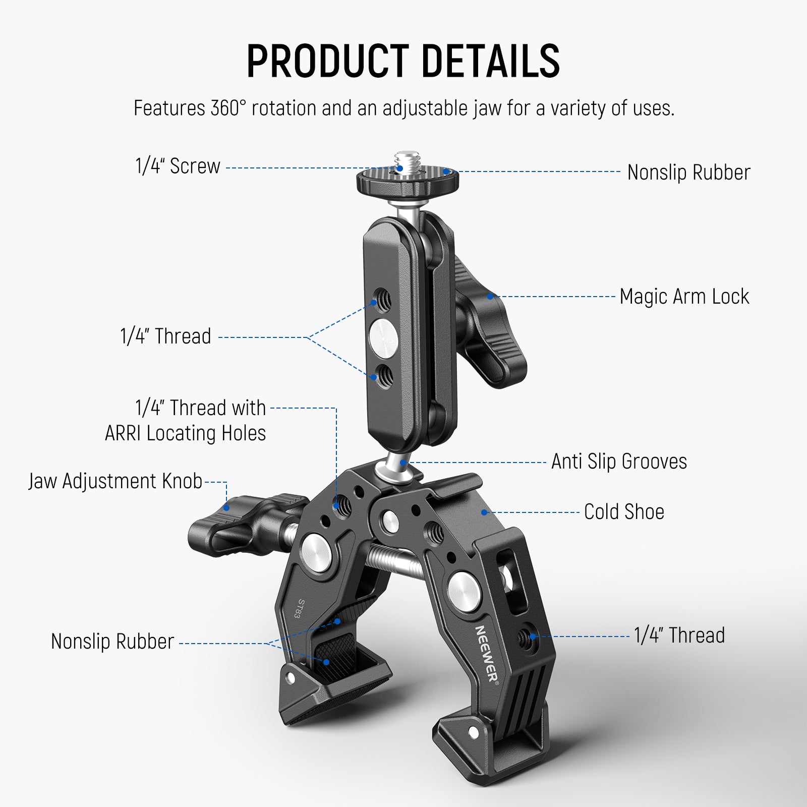 - Points de fixation multiples : grâce à ses filetages 1/4", 3/8", ses points de fixation ARRI et sa griffe porte-accessoires intégrée, la pince et le bras magique permettent de connecter de nombreux accessoires tels qu'un moniteur, un support d'épaule et une cage pour appareil photo. La griffe porte-accessoires intégrée permet une fixation rapide des éclairages d'appoint LED, des microphones, etc. (non compatible avec les flashes cobra).