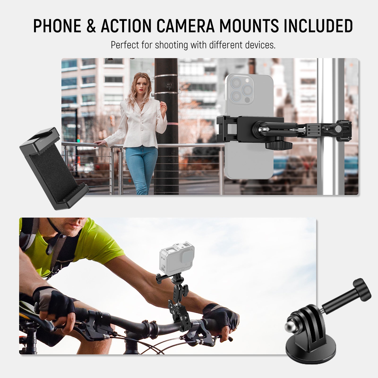 - Prise de vue avec appareil photo et smartphone : fixez votre smartphone (largeur : 55 à 85 mm) ou votre caméra d’action grâce aux adaptateurs fournis. Compatible avec iPhone 16, 15 Pro Max, 14, 13, 12, 11 Pro Max Plus, Mini, X, Xs, XR, Samsung Galaxy S22, S23, S24 Ultra, Huawei P60, GoPro Hero 12, 11, 10, 9, 8, 7 Black, DJI Osmo Action 4, 3, Insta360 X3, X4, Ace Pro, etc. Vous pouvez également connecter des moniteurs, éclairages LED, microphones et autres accessoires grâce à la vis 1/4". Charge utile maximale : 3 kg.