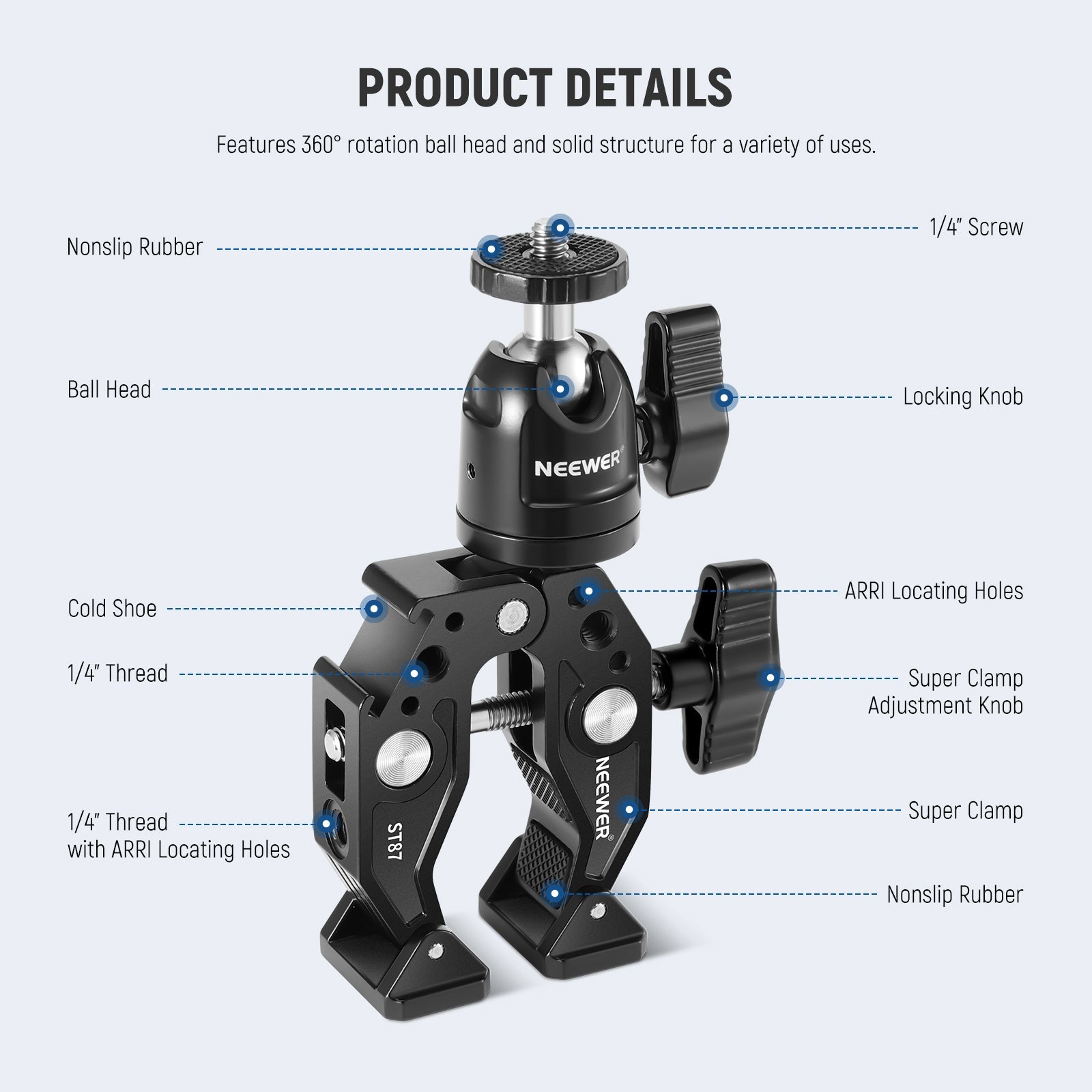 - Points de fixation pour accessoires : plusieurs pas de vis 1/4" et une griffe porte-accessoires permettent de fixer divers accessoires NEEWER, tels que le bras articulé ST25C, le microphone CM14 PRO et la lampe d'appoint LED PL81, pour une meilleure création de contenu.