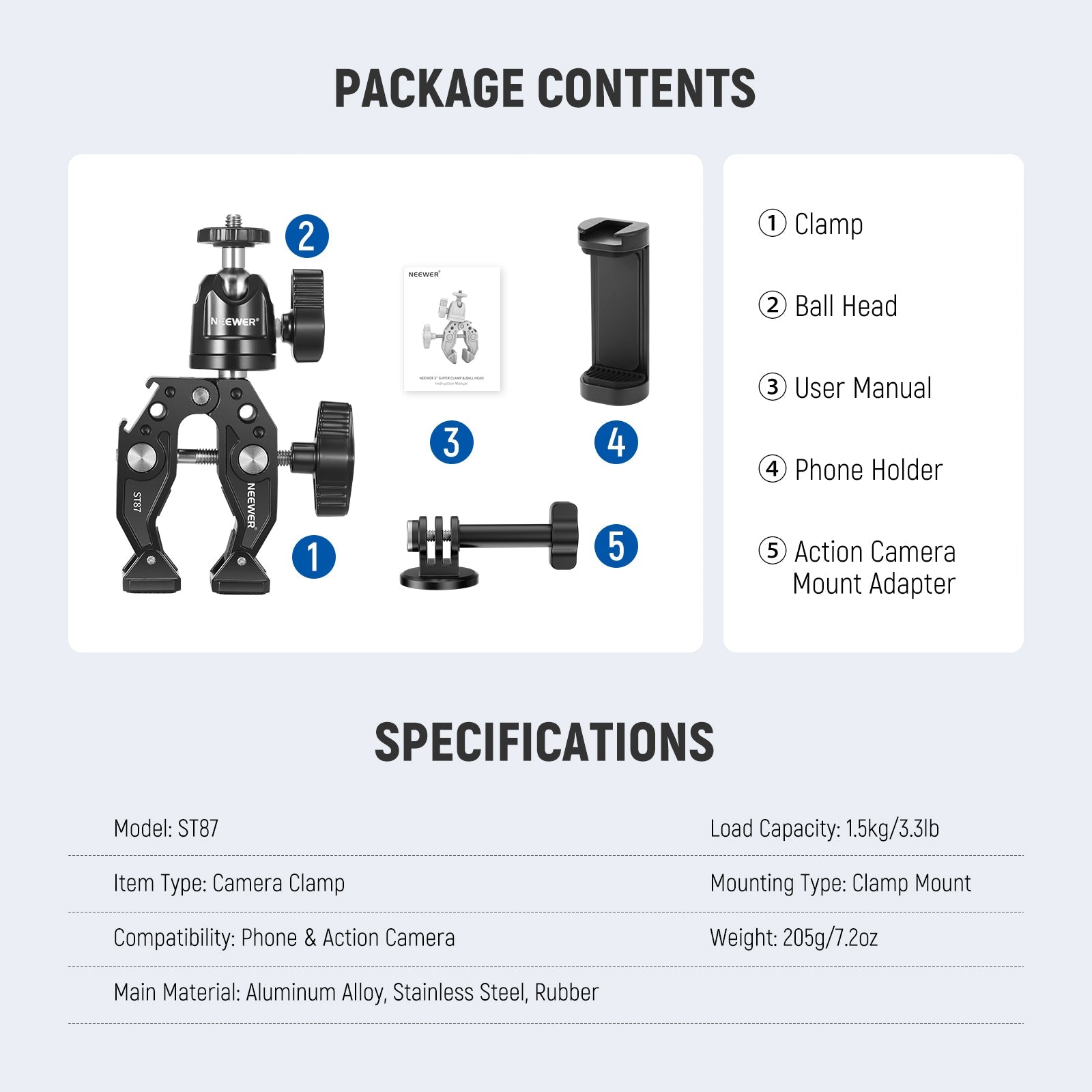 - Matériau solide et durable - Fabriqué en alliage d'aluminium robuste, ce support est durable et polyvalent. Il restera fermement en place, que ce soit pour des prises de vue professionnelles ou des activités sportives en extérieur. Le coussinet en caoutchouc à l'intérieur de la pince renforce sa prise. Charge maximale : 1,5 kg.