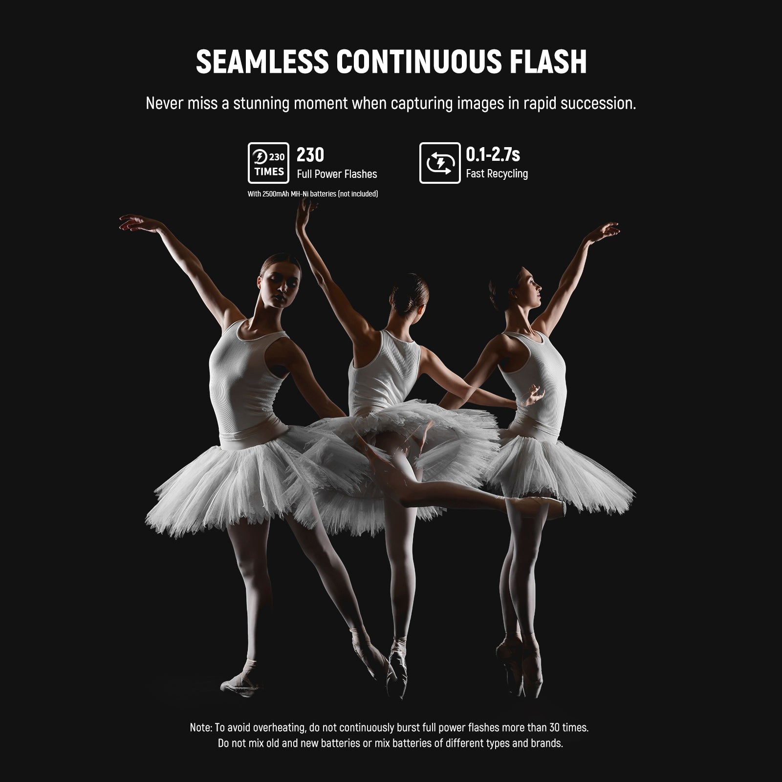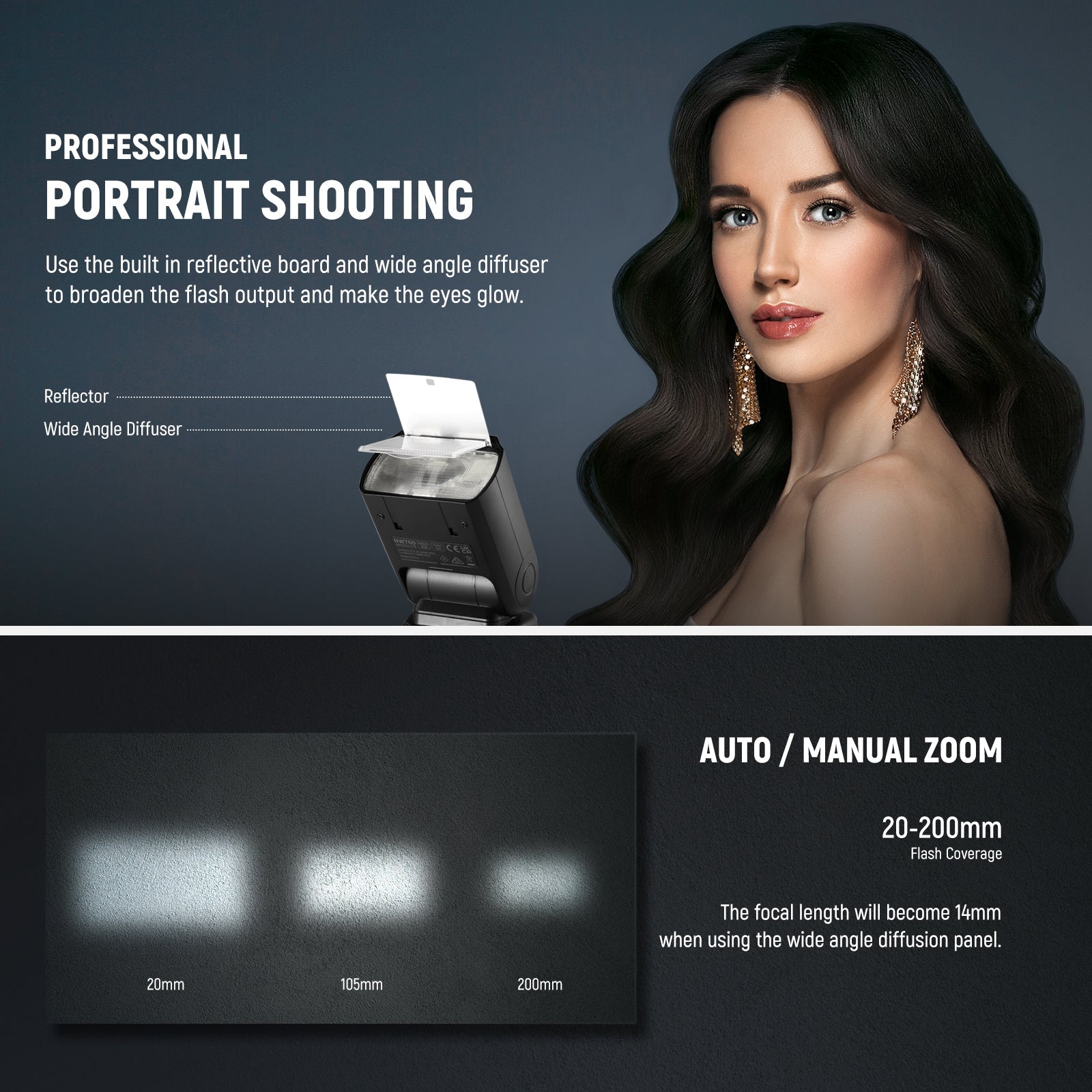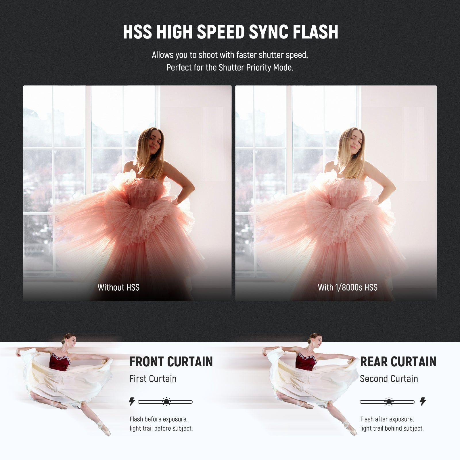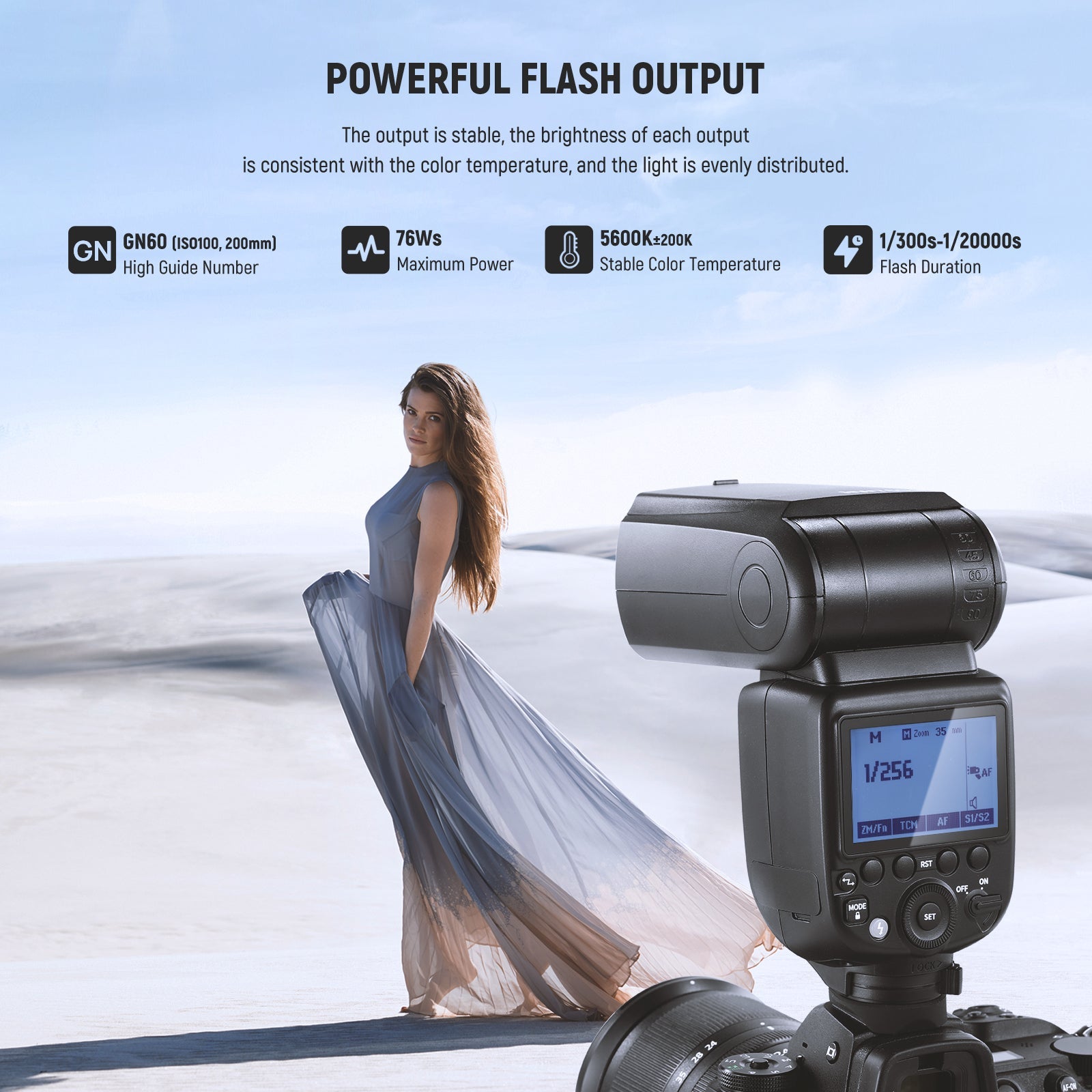 • Modes flash TTL/M/MULTI - Ce flash intègre les modes TTL (automatique), M (manuel) et MULTI (stroboscopique). Le mode M prend en charge 81 niveaux de puissance (1/256 à 1/1) et un commutateur TCM permet une conversion rapide entre les modes TTL et M. Il prend également en charge la synchronisation haute vitesse HSS à 1/8000 s, un temps de recyclage de 0,1 à 2,7 s, une durée d'éclair de 1/300 s à 1/20000 s, 100 éclairs stroboscopiques (199 Hz), la compensation d'exposition du flash (FEC), le bracketing d'exposition du flash (FEB), le verrouillage d'exposition du flash (FEL), la synchronisation avant/arrière et les modes S1/S2 optiques.