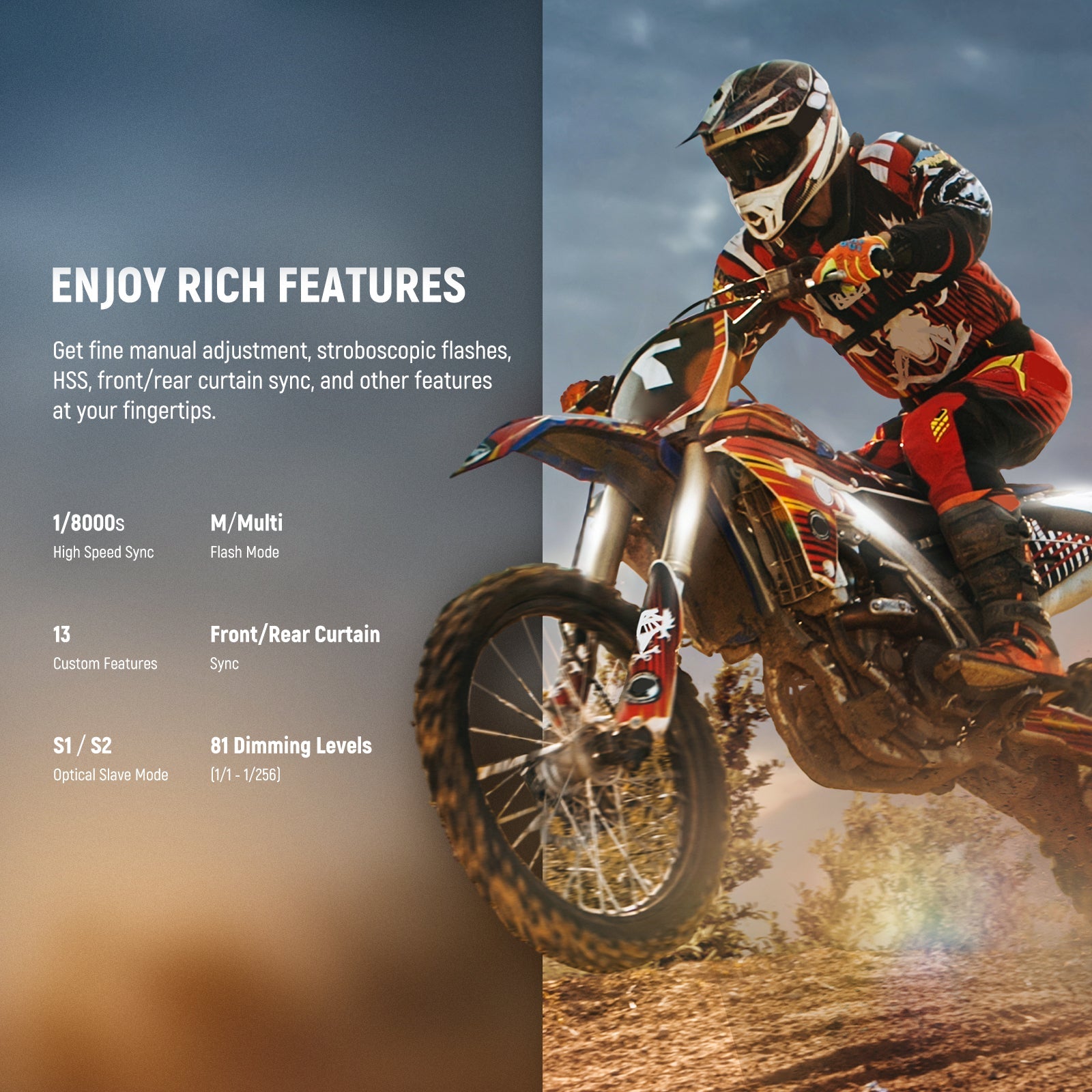 • Performances avancées : doté d’une puissance de 76 Ws, il offre les modes flash automatique TTL, flash manuel, flash stroboscopique et esclave optique (S1/S2). Grâce à sa synchronisation haute vitesse jusqu’à 1/8000 s et à ses options de synchronisation sur le premier et le deuxième rideau, il assure un contrôle précis de votre éclairage. Profitez également de fonctionnalités supplémentaires telles que la correction d’exposition au flash (FEC), le bracketing d’exposition au flash (FEB), le verrouillage d’exposition au flash (FEL), et bien plus encore.