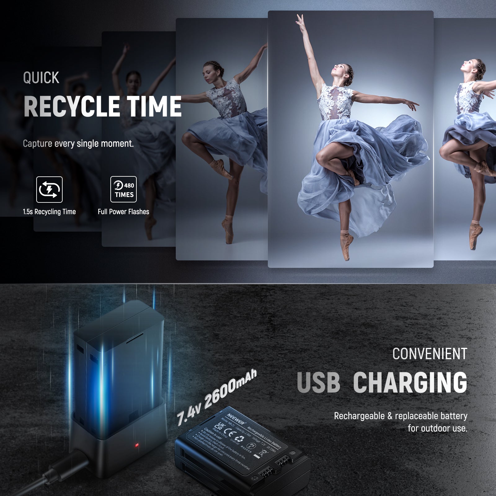 • Batterie haute capacité et orientation flexible : la batterie au lithium 7,4 V 2 600 mAh (NB-Z1) offre 480 éclairs à pleine puissance, un temps de recyclage rapide de 1,5 s et une durée d’éclair réglable de 1/180 s à 1/20 000 s, pour une expérience de prise de vue optimale. La tête de flash permet un réglage horizontal de 0° à 330° et un réglage vertical de -7° à 120°, offrant une polyvalence de prise de vue inégalée.