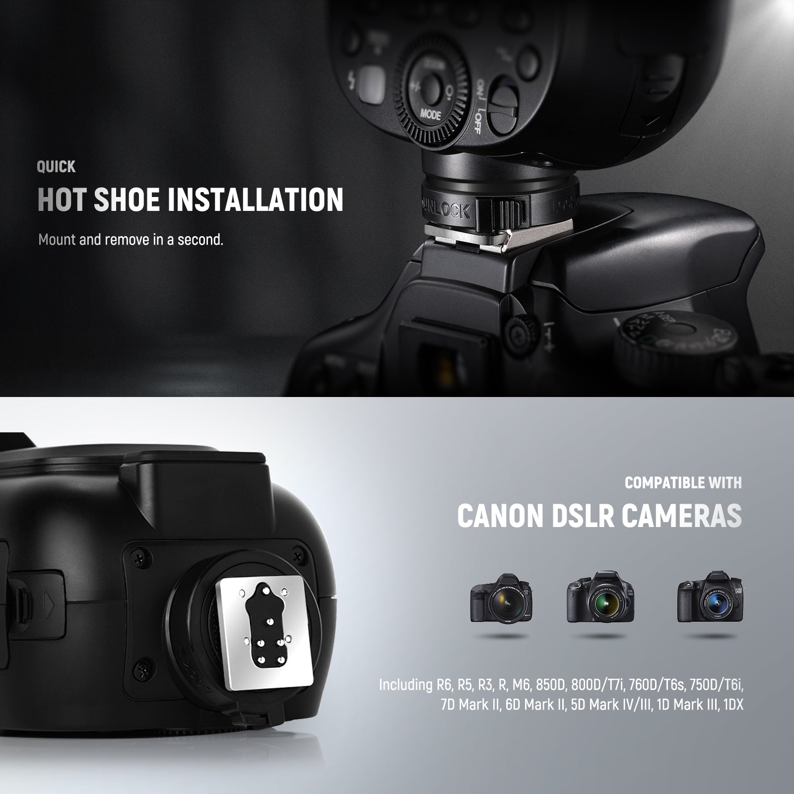 • Diffuseur magnétique en forme de dôme et large compatibilité : le diffuseur en forme de dôme adoucit et répartit la lumière uniformément, réduisant ainsi les éclairs et les ombres trop marqués. Ce flash est également compatible avec les kits GM-M1, CR-M2, AK-R1, les montures de type S2 et CRB1. Compatible avec les appareils photo Canon R6, R5, R3, R, M6, 850D, 800D, T7i, 760D, T6s, 750D, T6i, 650D, 600D, 7D Mark II, 7D, 6D Mark II, 6D, 5D Mark IV, III, II, 1D Mark III, 1DX, 550D, 500D, 450D, 90D, 80D, 70D, 60D, 50D, 1100D, 77D, SL3/250D, T7, 1500D, 2000D, T100, 3000D et 4000D (non compatible avec le RP R50).