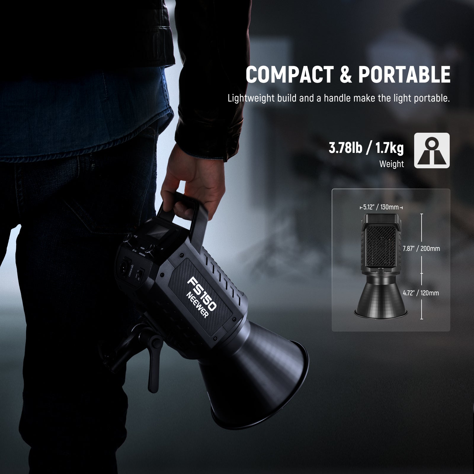 - Éclairage studio compact et puissant de 130 W - L'éclairage vidéo NEEWER FS150 utilise des LED COB haut de gamme à haut rendement pour une luminosité exceptionnelle, une puissance de 130 W sans scintillement et un éclairement maximal de 102 000 lux/m². Ce projecteur portable ne pèse que 1,7 kg et mesure 200 x 130 x 120 mm. Son adaptateur de fixation inclinable à 180° permet une grande liberté d'orientation. Il est idéal pour l'éclairage de portraits, les interviews, l'enregistrement de vidéos YouTube/TikTok, le tournage, le streaming en direct et la production en studio.