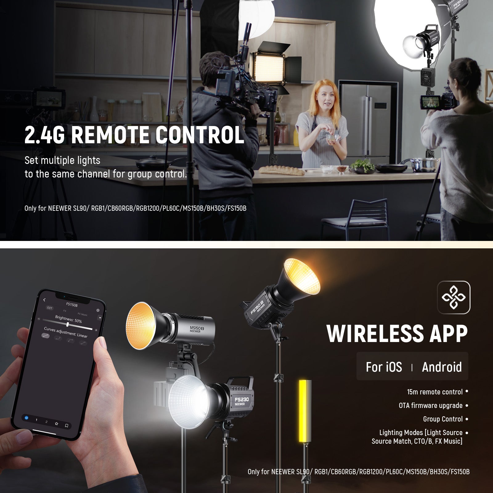 - Application Infinity et contrôle sans fil 2,4 GHz - L'application NEEWER prend en charge le contrôle de groupe et les mises à jour du firmware OTA. Elle offre également des fonctions avancées de contrôle de l'éclairage, telles que la source lumineuse et la musique. Le système 2,4 GHz intégré permet le contrôle de groupe de différents modèles (SL90 Pro, RGB1, RGB C80, RGB 1200, MS60C, MC60B, MS150B, BH30S, FS150B, CB200B et CB60B) sur les canaux 00 à 99. Lorsque tous les éclairages sont configurés sur le même canal, la modification de l'un d'eux entraîne la modification simultanée des autres.