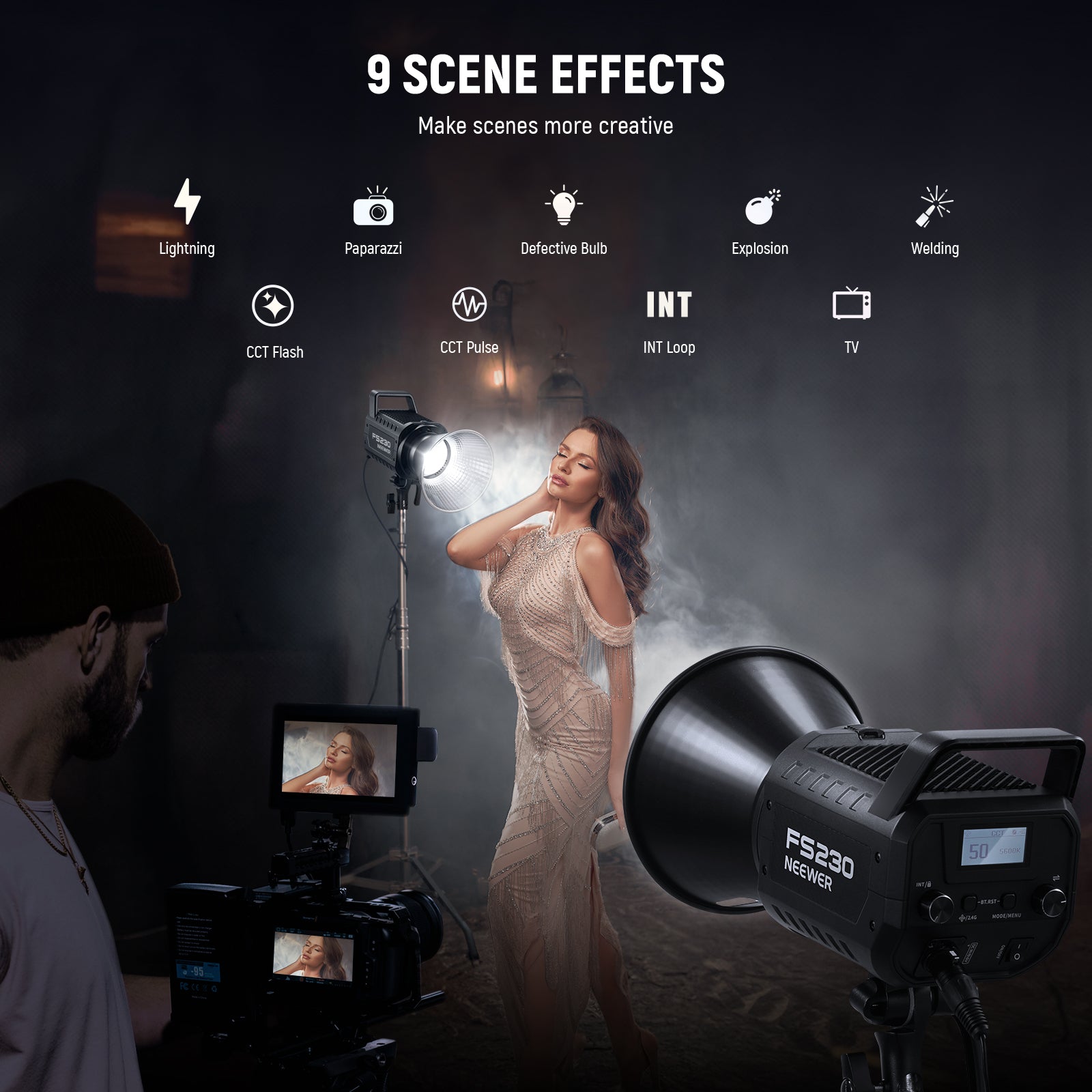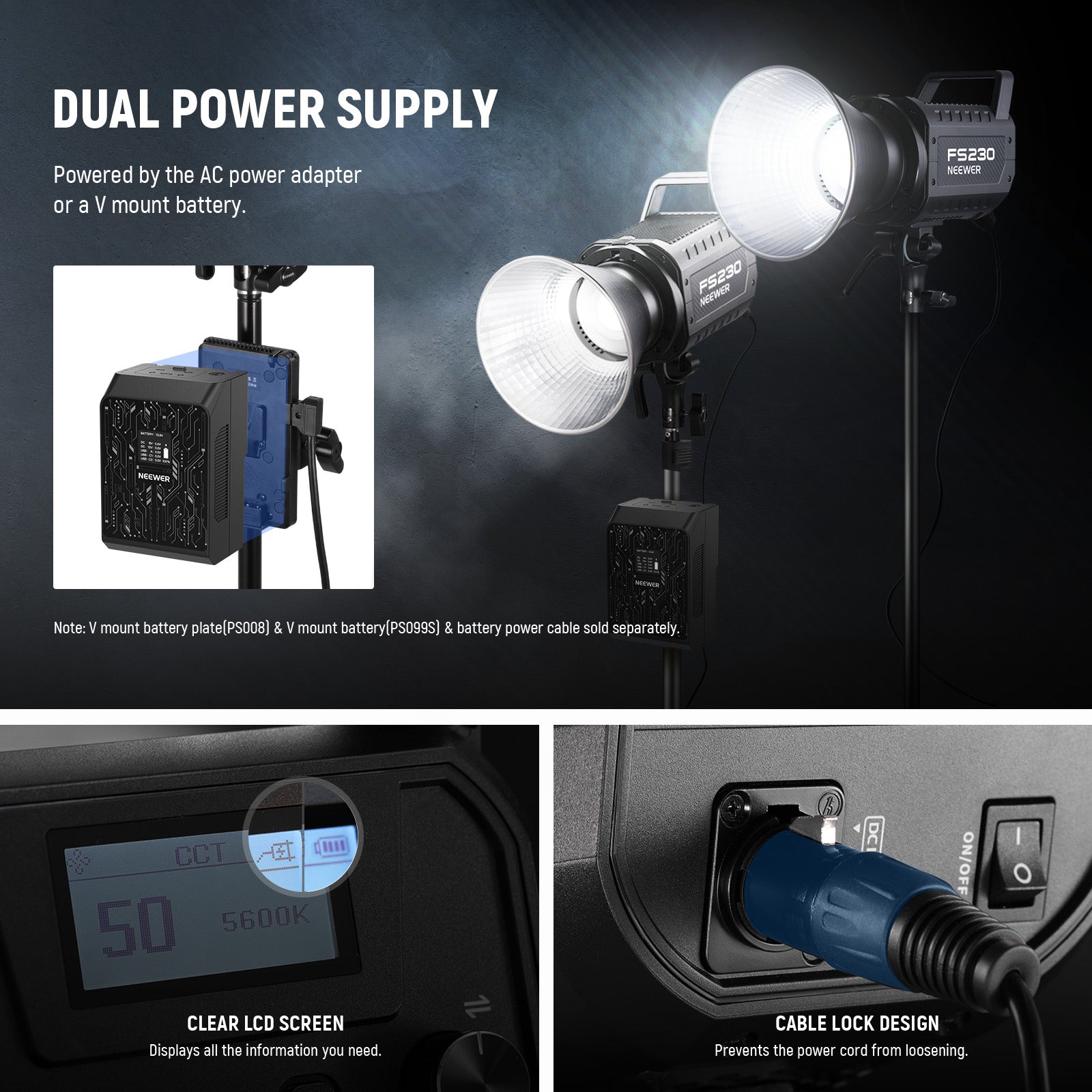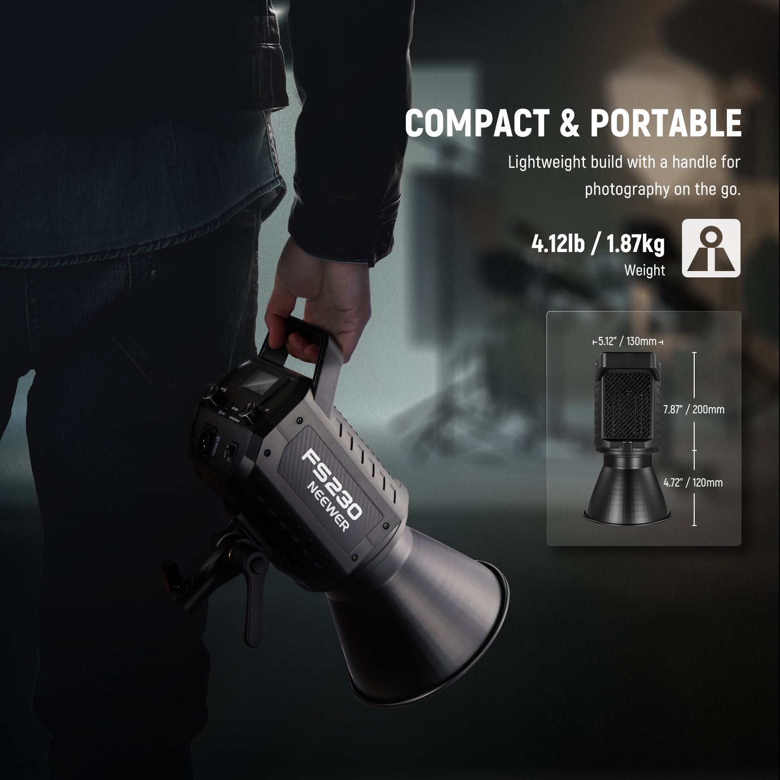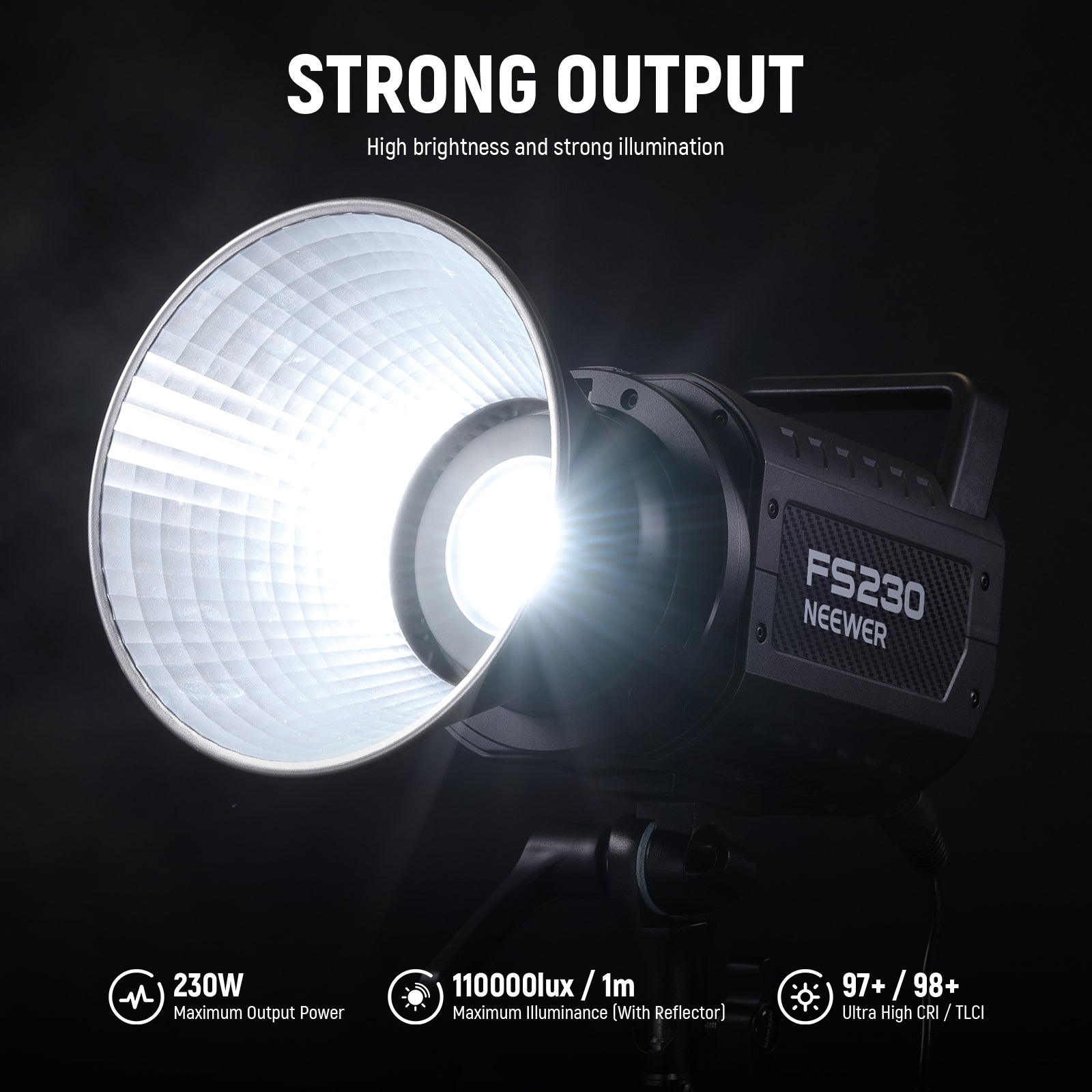 - Éclairage studio compact et puissant de 230 W - La lampe vidéo LED NEEWER FS230 (prise US) utilise une LED COB à haut rendement pour une puissance exceptionnelle de 230 W et un éclairement maximal de 110 000 lux/m². Ce projecteur portable ne pèse que 1,7 kg et mesure 200 x 130 x 120 mm. Son adaptateur pour trépied inclinable à 180° est idéal pour l'éclairage de portraits, les interviews, l'enregistrement de vidéos YouTube/TikTok, le tournage, le streaming en direct et la production en studio.