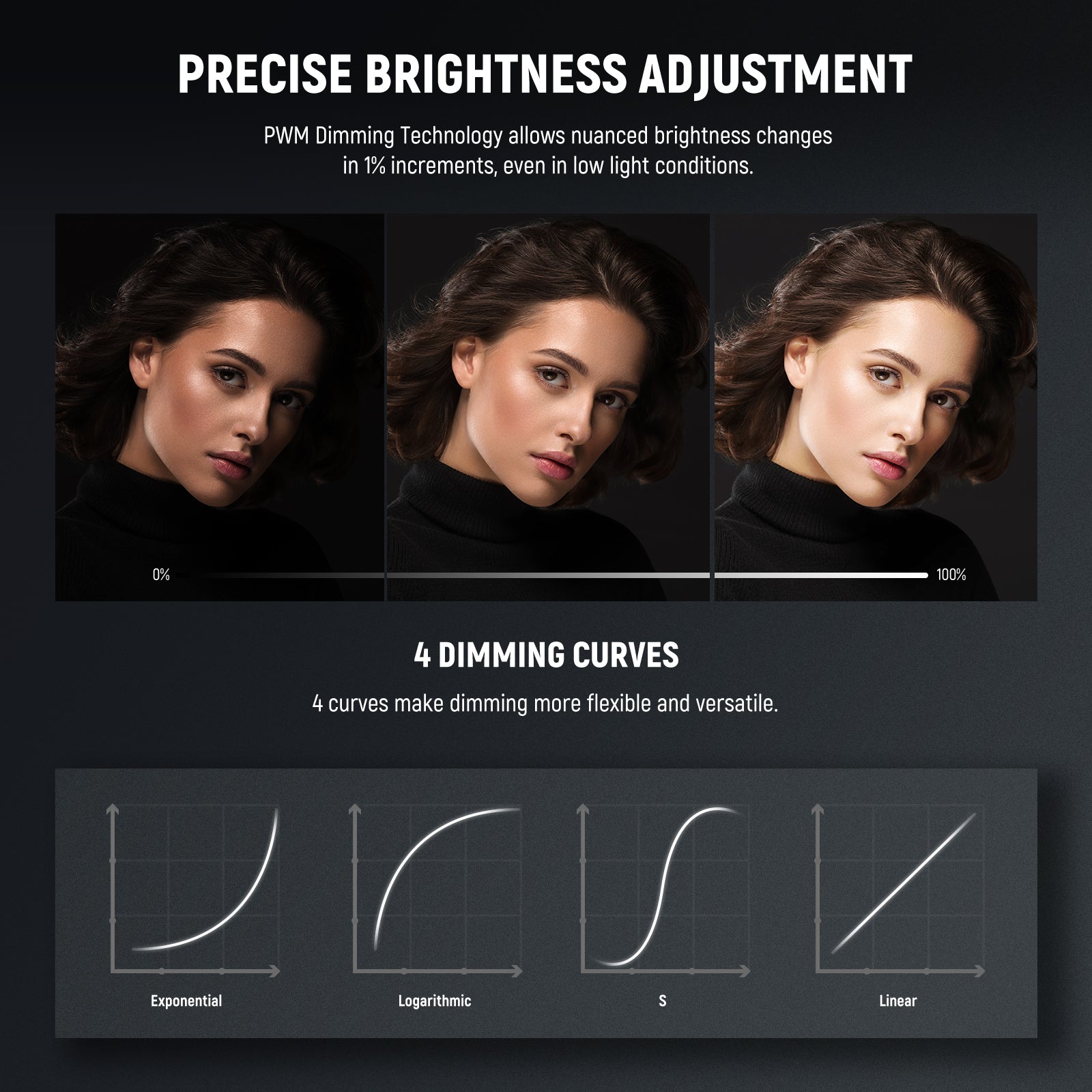- Gradation PWM précise et lumière du jour 5600K : la technologie de gradation PWM permet un réglage précis de la luminosité de 0 à 100 % par incréments de 1 % sans scintillement et propose 4 types de gradation (exponentiel, logarithmique, S et linéaire) pour une gradation précise dans différentes conditions. La lumière du jour froide de 5600K offre une température de couleur uniforme. Un IRC élevé de 97+ et un TLCI de 98+ garantissent un rendu des couleurs fidèle. 9 effets FX rendent les vidéos créatives et originales.