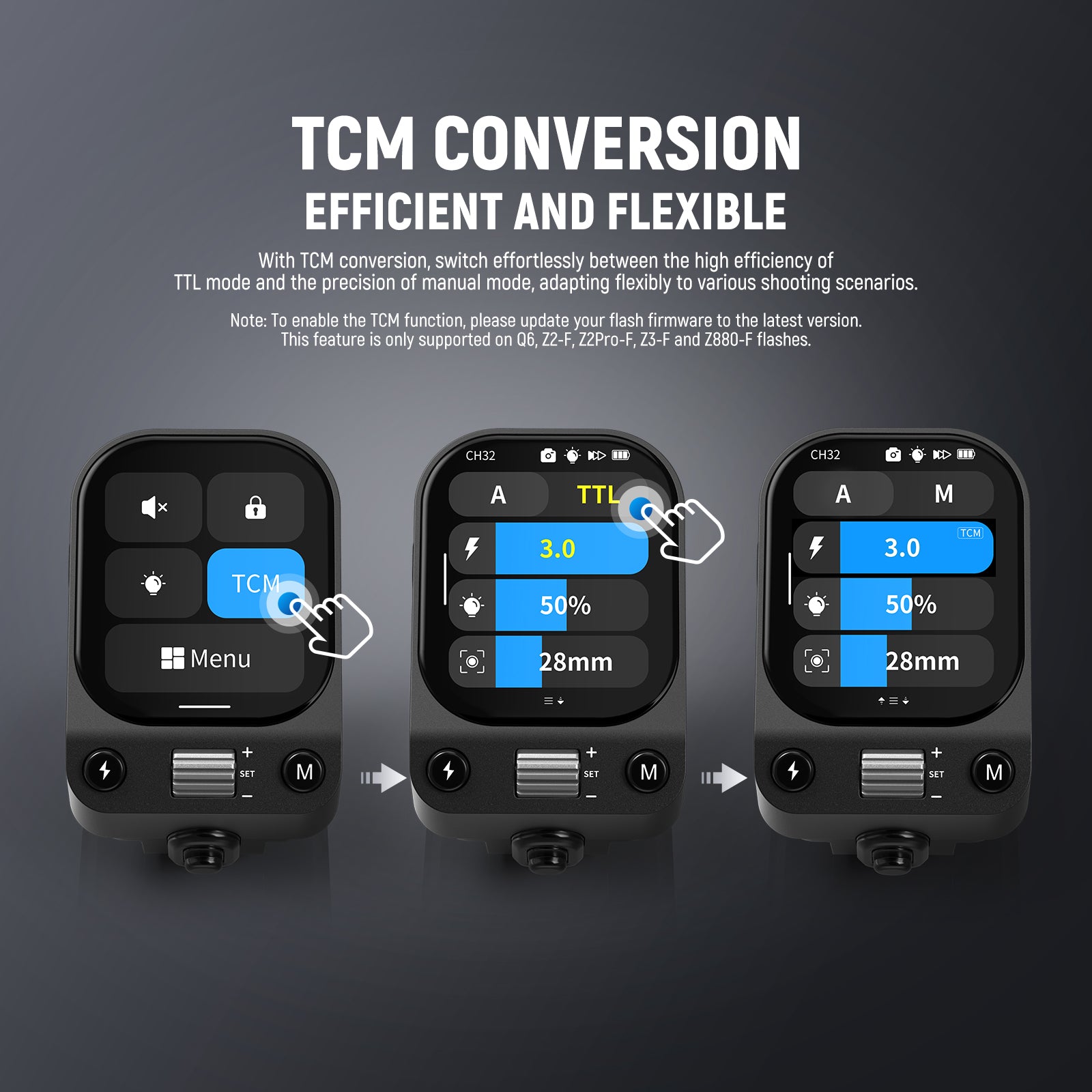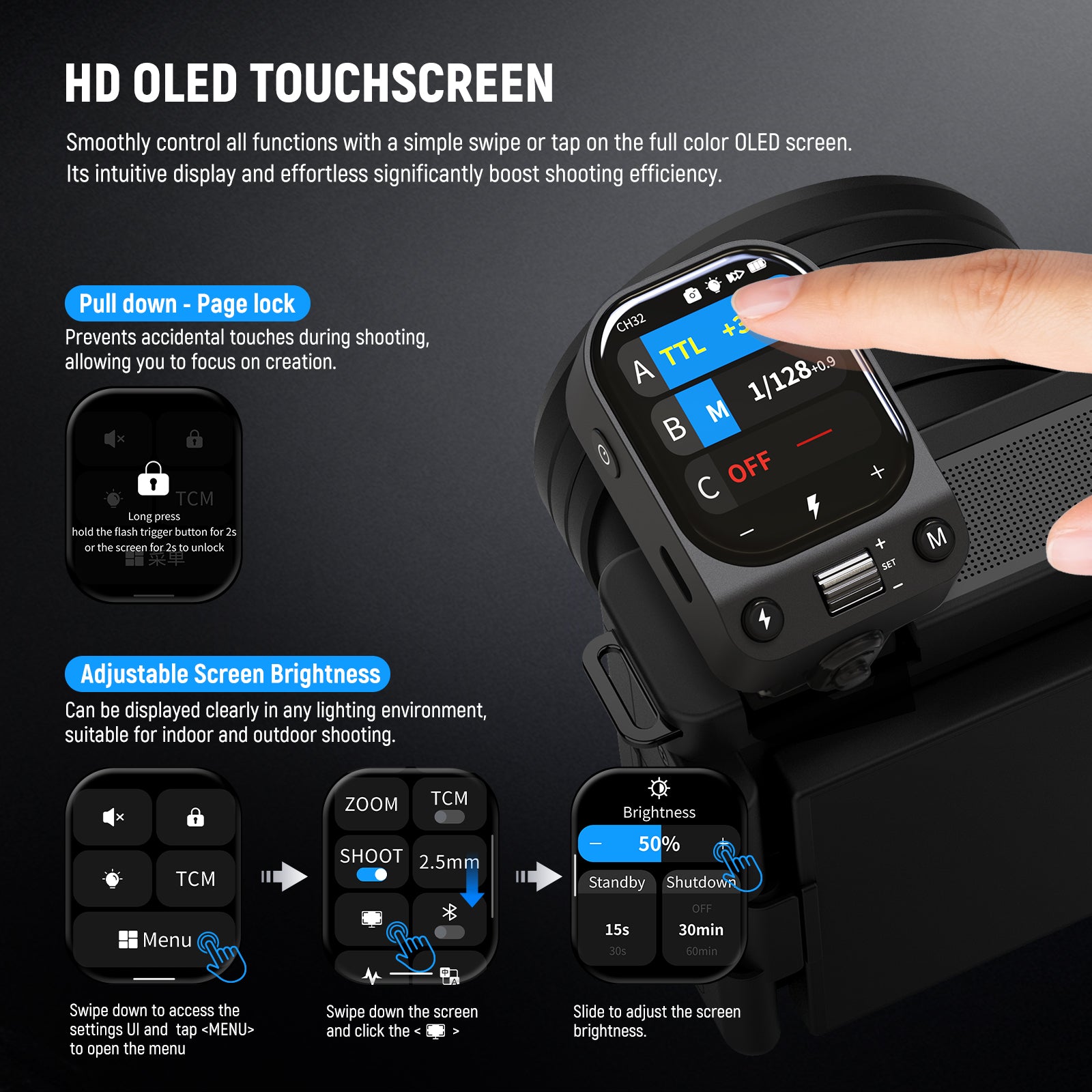 - Déclencheur de flash professionnel avec écran tactile - Ce déclencheur de flash sans fil est doté d'un écran tactile OLED à luminosité réglable et permet une utilisation aisée même avec des gants en hiver. Il prend en charge le flash automatique TTL, la synchro haute vitesse 1/8000 s, la correction d'exposition au flash (FEC), le flash manuel, le déclenchement instantané, le flash stroboscopique, le contrôle de la lampe pilote, le zoom, le déclenchement monopoint, le contrôle de groupe, etc. Remarque : Désactivez le mode de contact unique pour les modes TTL et stroboscopique.