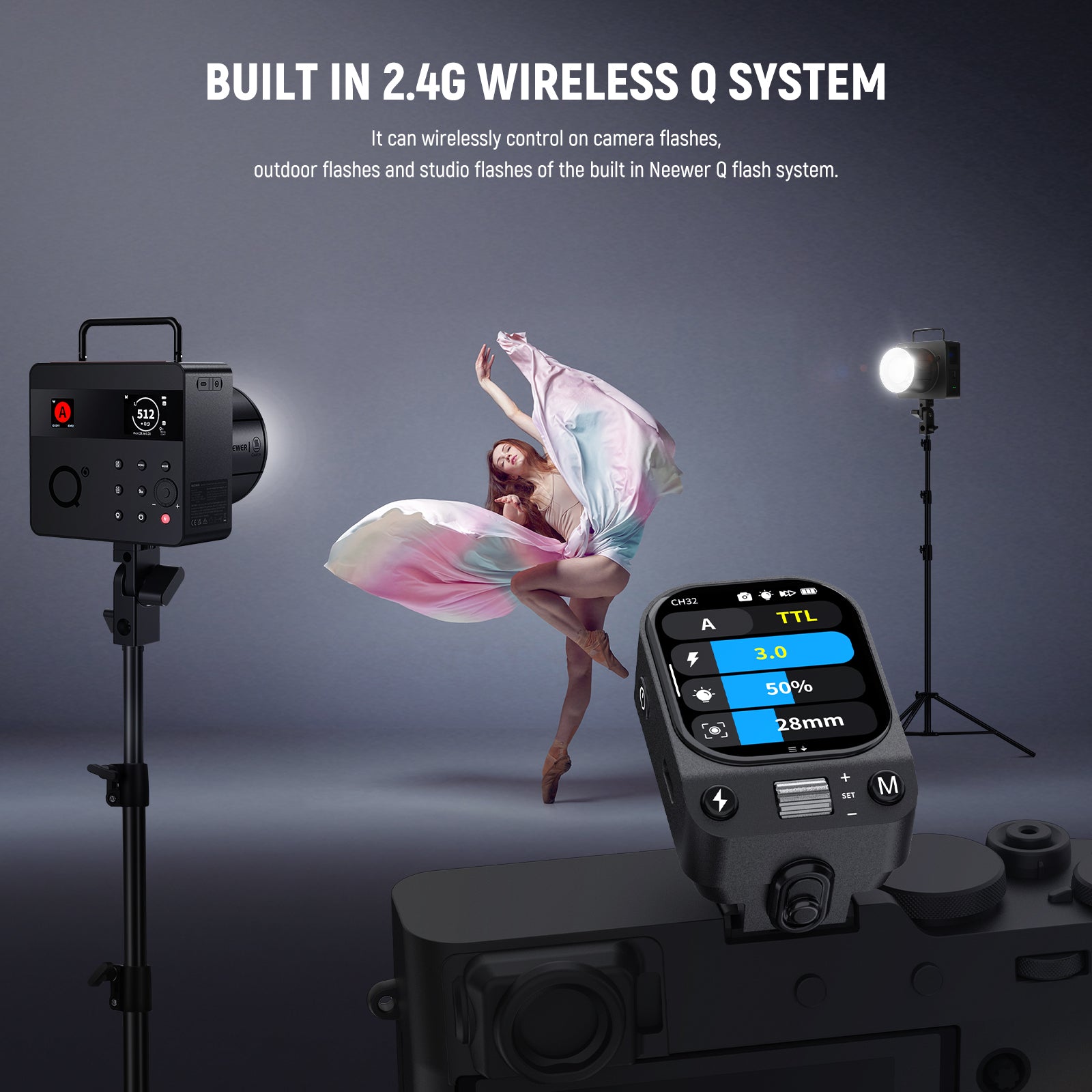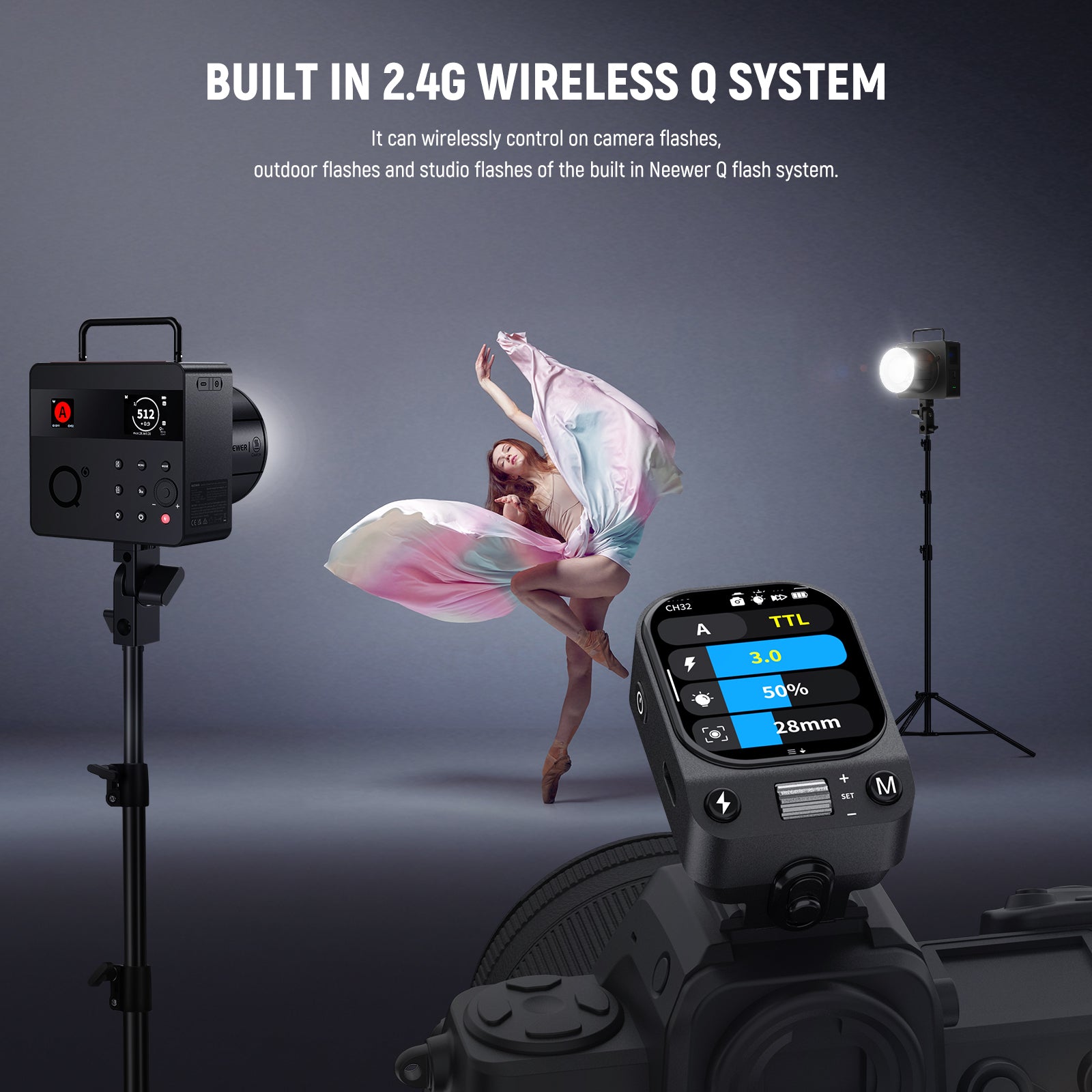 - Système sans fil Q 2,4 GHz intégré : déclenchez sans fil les flashs NEEWER NW420-C, Z1-C, Z2-C, Z760-C, Z880-C, NW760-C, Z2PRO-C, S102-400W Pro, NW655-C et QC (déclenchement hors caméra uniquement), ou contrôlez d’autres flashs sans système Q via un récepteur QR NEEWER et un câble de synchronisation 2,5 mm (vendus séparément). Fonction de balayage des canaux pour détecter les canaux libres et réduire les interférences entre les 5 groupes, 32 canaux et les identifiants 01 à 99 dans un rayon de 100 m.