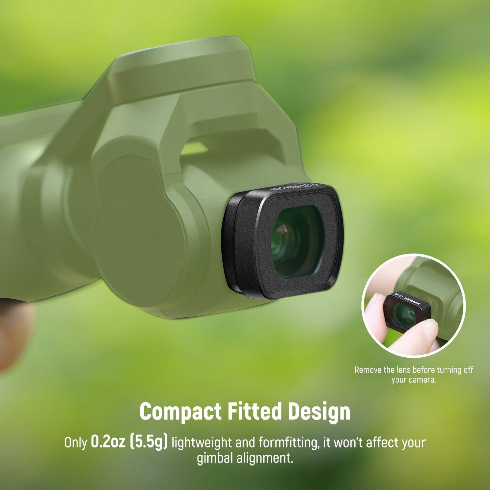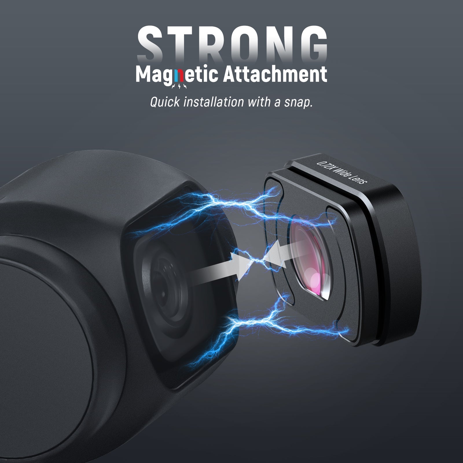 - Fixation magnétique rapide : l’installation est simple. Il suffit de clipser cet objectif magnétique léger (5,4 g) sur l’appareil photo et de commencer à filmer. Remarque : retirez l’objectif avant de ranger le stabilisateur.