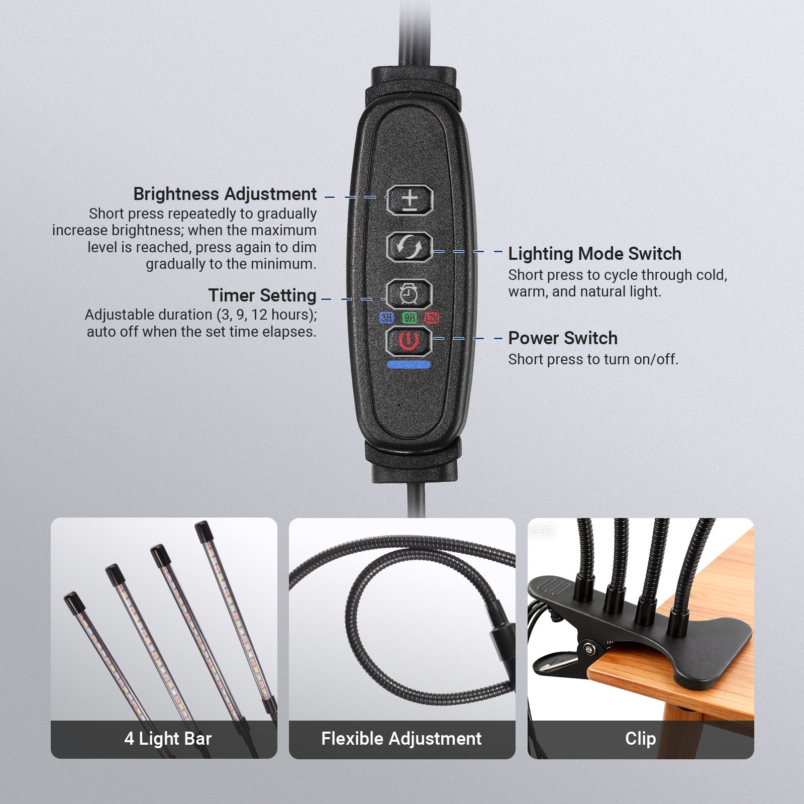 - Wide Coverage & Flexible Adjustment- Easily clamped onto the edge of a desk, the four 4.5" light bars with flexible arms extend up to 26.8" and can bend in any direction to cover more plants and promote their growth