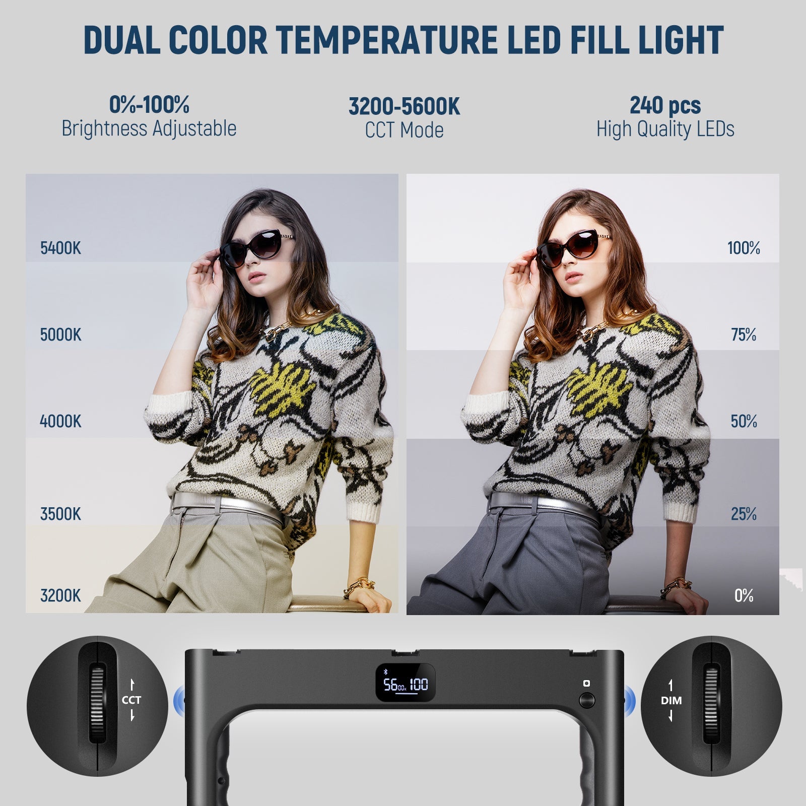 - Éclairage bicolore réglable : grâce à ses 240 LED de haute qualité réparties sur deux panneaux lumineux, ce support pour appareil photo NEEWER A111 II peut servir d’anneau lumineux carré pour maintenir votre appareil photo ou votre téléphone. Il offre une température de couleur réglable de 3 200 K à 5 600 K (blanc froid ou blanc chaud), une intensité lumineuse de 0 à 100 %, une puissance maximale de 16 W, un flux lumineux de 1 700 lux à 0,5 m et un IRC supérieur à 97 pour une reproduction fidèle des couleurs. Sa lumière douce et équilibrée illumine votre visage, lisse votre peau et atténue les imperfections.