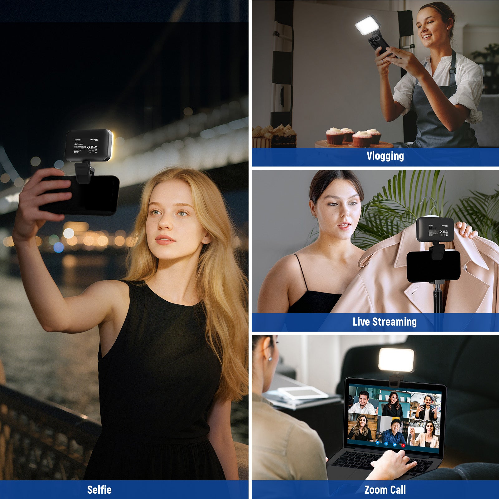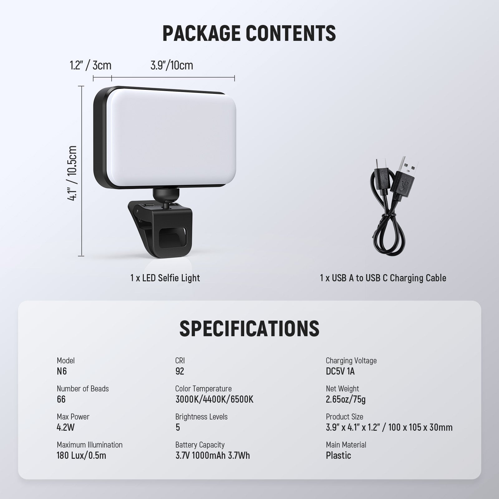 - Kit d'éclairage photo polyvalent - Comprend 1 lampe selfie LED, 1 pince de fixation et 1 câble de chargement USB A vers USB C. Cette lampe LED illumine votre teint et vous met en valeur à l'écran, que ce soit pour une réunion Zoom, un live sur les réseaux sociaux, un vlog pour votre chaîne YouTube/TikTok, un podcast ou simplement pour vous maquiller.