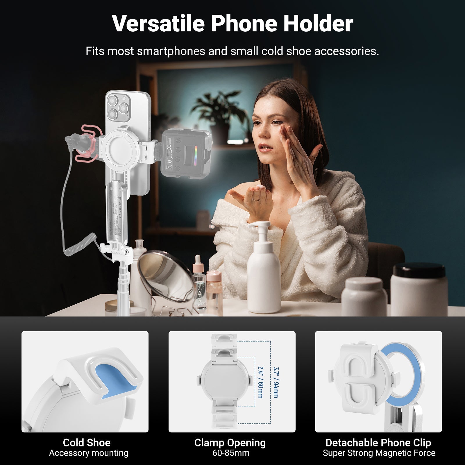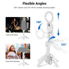 - 360° Universal Phone Holder- With a 2.4"-3.3"/60-85mm opening range, the phone clamp is compatible with iPhone 16 Pro Max iPhone 15 Pro Max Samsung Galaxy S24 Ultra and other smartphones. The 360° rotation allows for vertical and horizontal shooting, while the 225° tilt offers variable camera angles