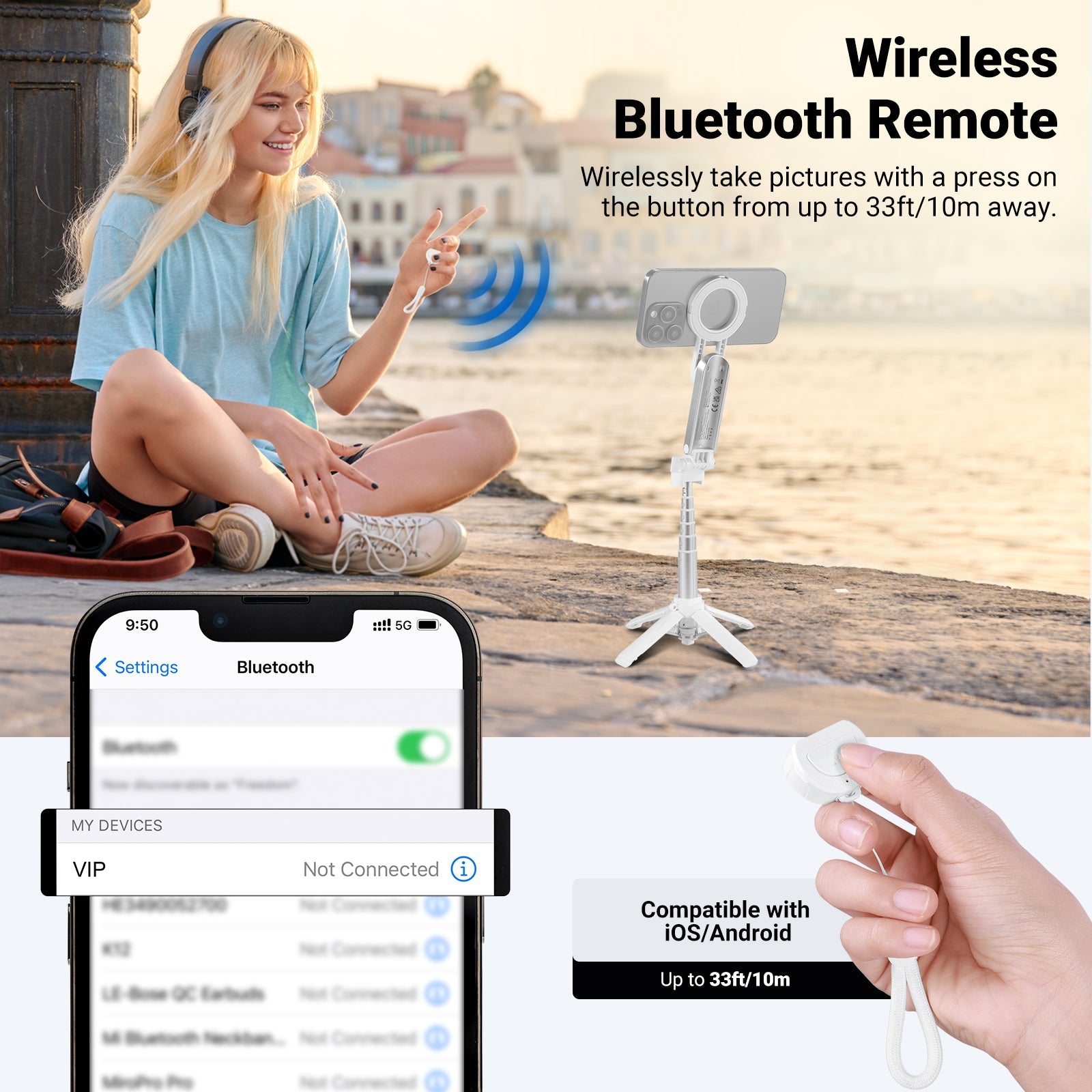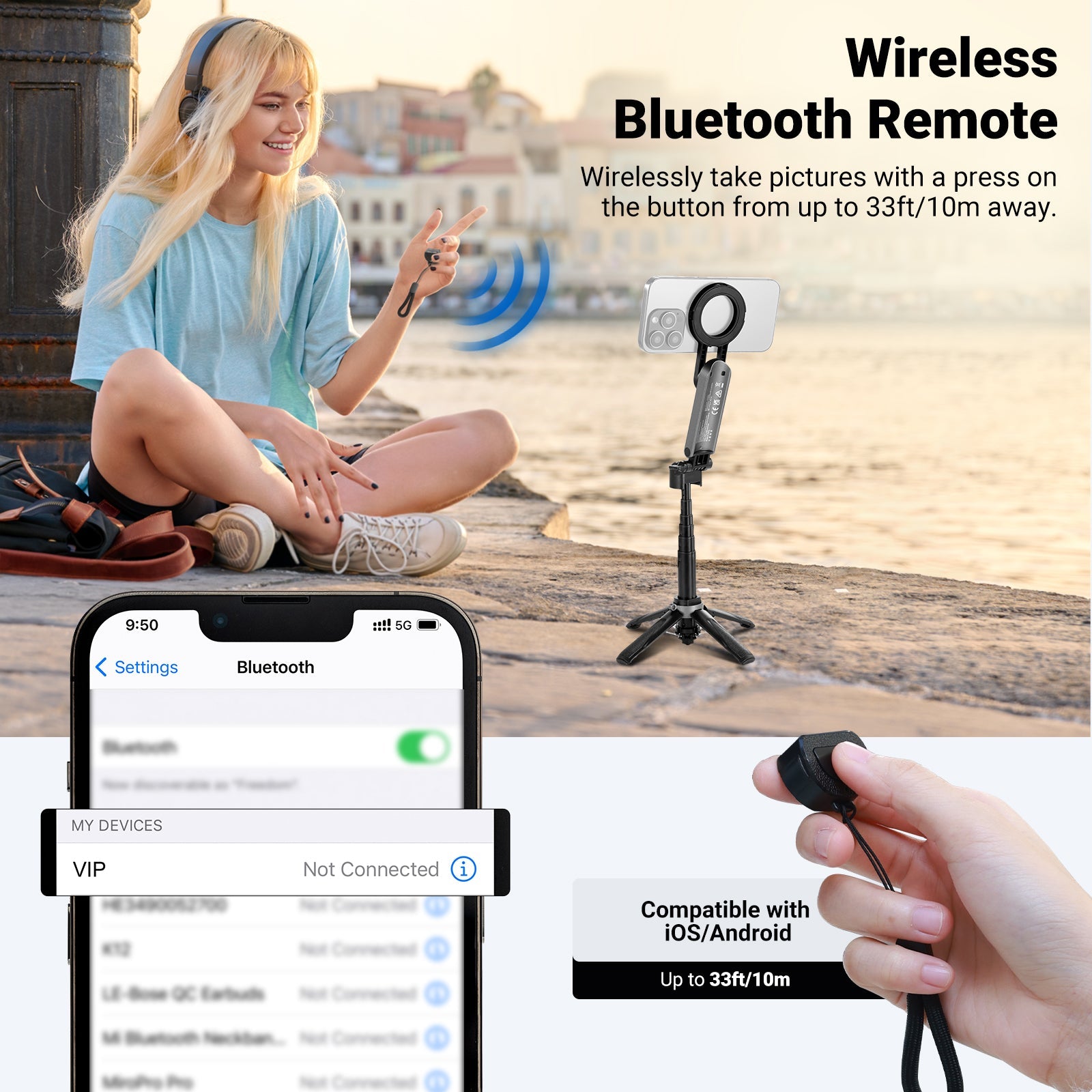 - Bluetooth Remote Shutter- Pair with your phone via Bluetooth and wirelessly capture photos and videos in a range of 33ft/10m. The detachable remote shutter release unit of this phone tripod enables handheld use