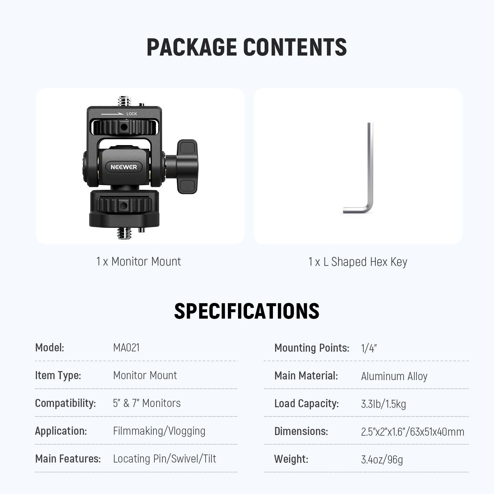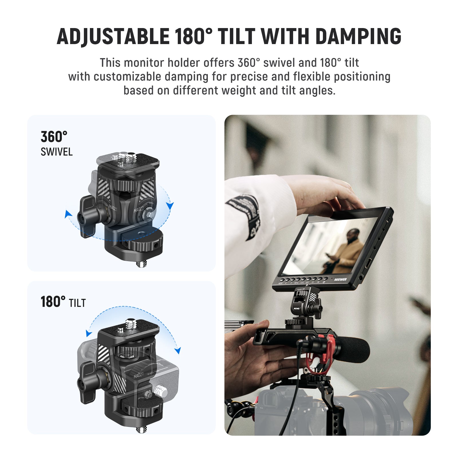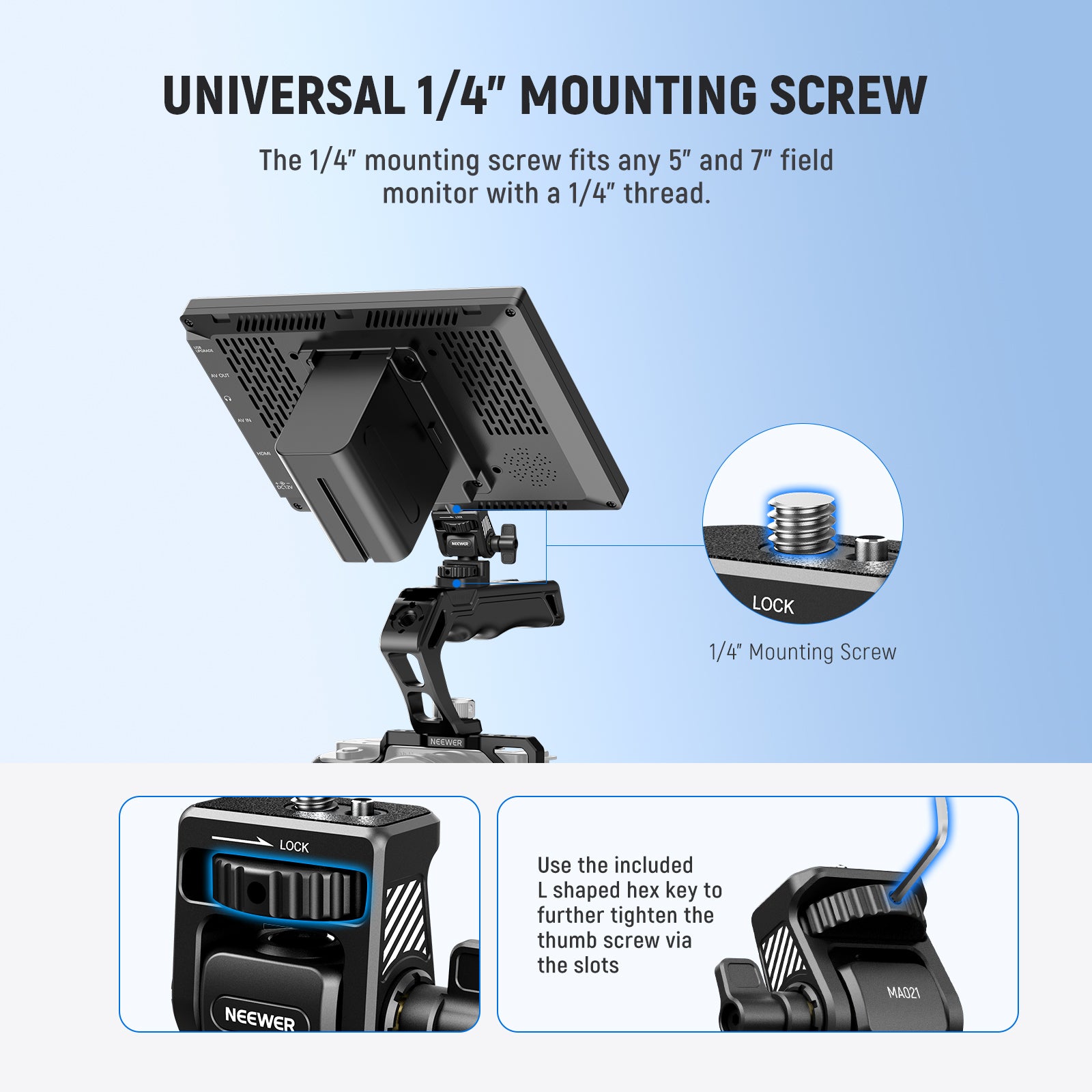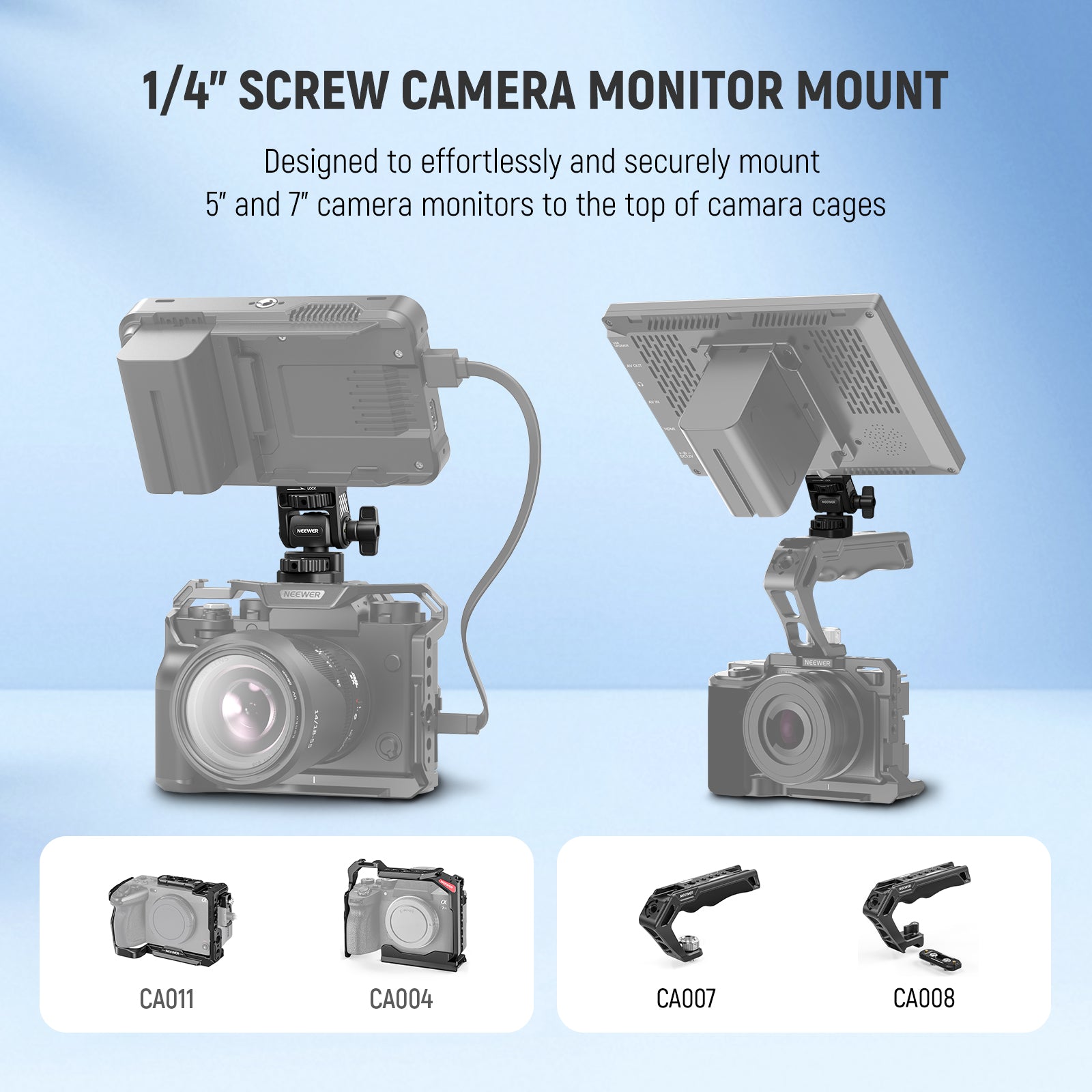 - Pour moniteurs de terrain 5" et 7" - Conçu pour les moniteurs de terrain 5" et 7", ce support avec vis 1/4" est compatible avec les cages SmallRig et NEEWER, ainsi qu'avec les appareils photo Canon, Sony, Nikon et Fujifilm. Il est également compatible avec les systèmes de fixation vidéo, les poignées supérieures et latérales, les sangles pour stabilisateur et les griffes porte-accessoires. Idéal pour le vlogging, le tournage et la photographie.