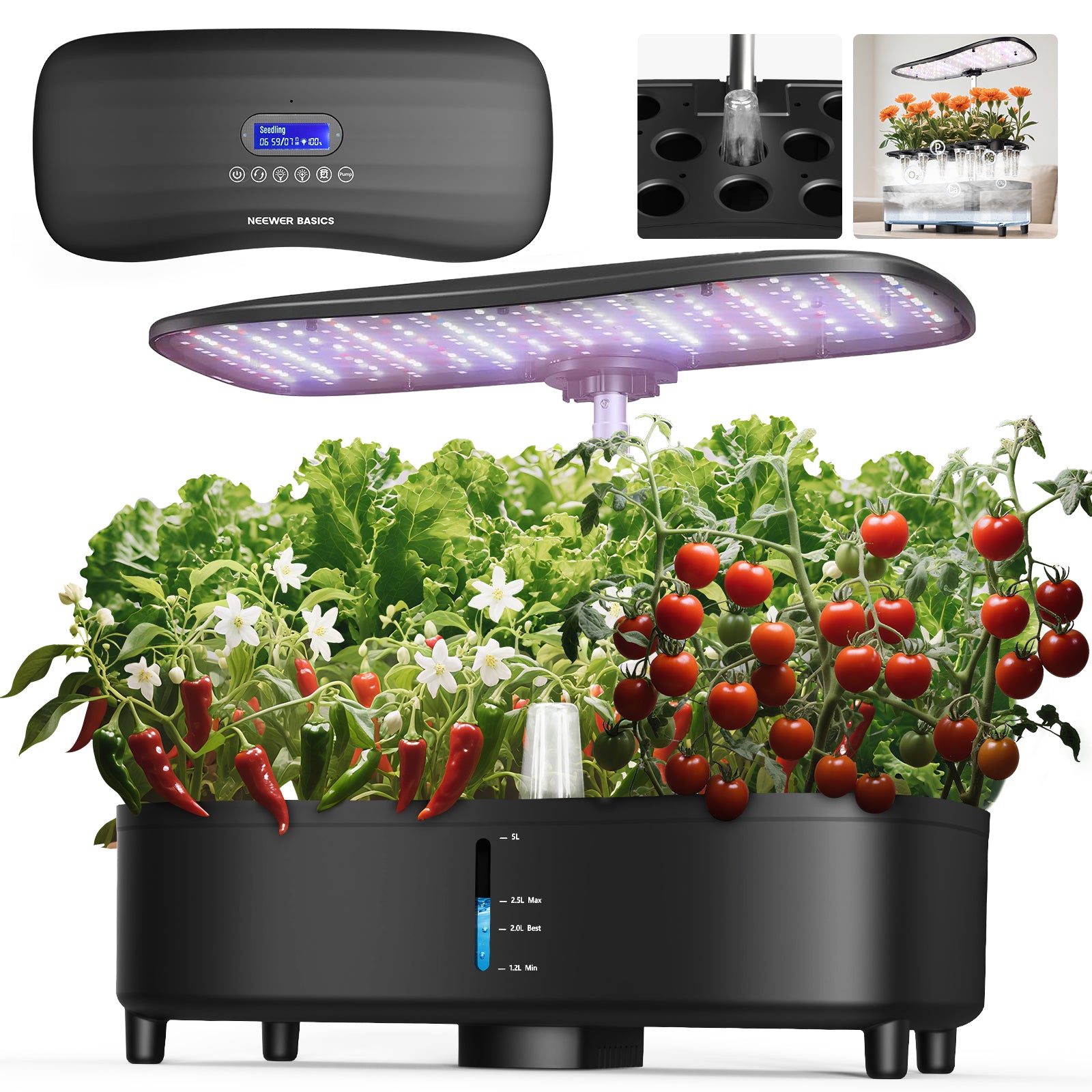 - Marquages de niveau d'eau jusqu'à 5 L et minuterie réglable - Le réservoir d'eau de 5 L est doté de marquages clairs pour un contrôle précis du niveau d'eau, incluant la limite supérieure recommandée (2,5 L), le niveau de remplissage optimal (2 L) et le niveau minimum requis (1,2 L). La minuterie intégrée permet des cycles lumineux automatisés de 1 à 23 heures pour favoriser une croissance homogène. Ce système aéroponique est idéal pour les personnes occupées mais passionnées par le jardinage d'intérieur durable. C'est un système hydroponique plus efficace qu'une pompe à eau pour la maison, la cuisine ou le bureau.
