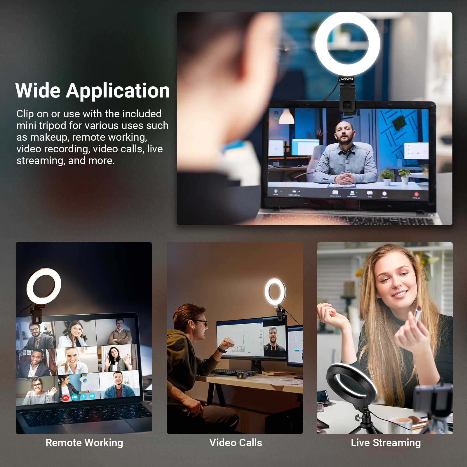 Dotée de 60 LED, la lampe annulaire NEEWER BR60 offre un éclairage jusqu'à 450 lx à 0,5 m, une température de couleur de 3000 à 6000 K et un IRC > 97 . Cette lampe peut être fixée sur les ordinateurs portables, les ordinateurs de bureau, les écrans et les moniteurs d'une épaisseur inférieure à 2,5 cm (1 pouce ) et comprend un mini trépied pour une utilisation polyvalente : maquillage, selfies, enregistrements vidéo TikTok/YouTube , appels FaceTime et Zoom, visioconférences, diffusion en direct , vlogging, etc.