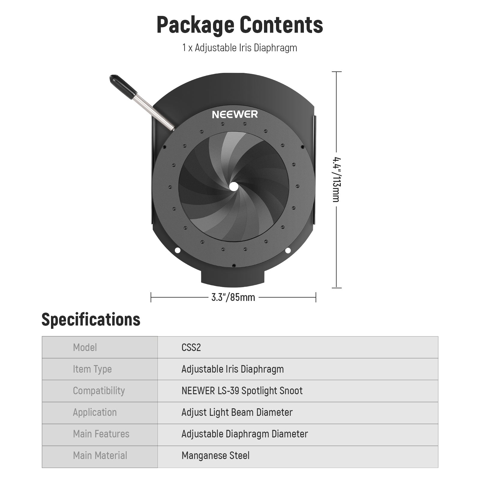 - Conçu pour le projecteur LS-39 – Spécialement conçu pour le snoot du projecteur NEEWER LS-39, ce diaphragme à iris modifie la taille du faisceau lumineux. Un accessoire économique qui offre encore plus de polyvalence à votre snoot de projecteur NEEWER LS-39.