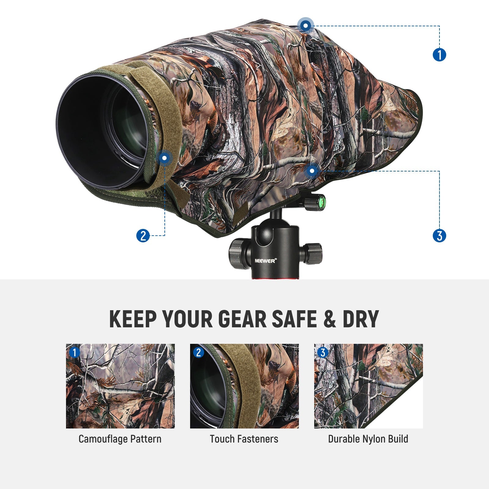 - Conception camouflage double face - Cette protection anti-pluie pour objectif d'appareil photo permet aux photographes animaliers de se fondre dans leur environnement et de réaliser des clichés naturels sans interruption. Sa conception réversible leur permet de réagir rapidement aux changements de météo ou de capturer des moments spontanés sans délai.