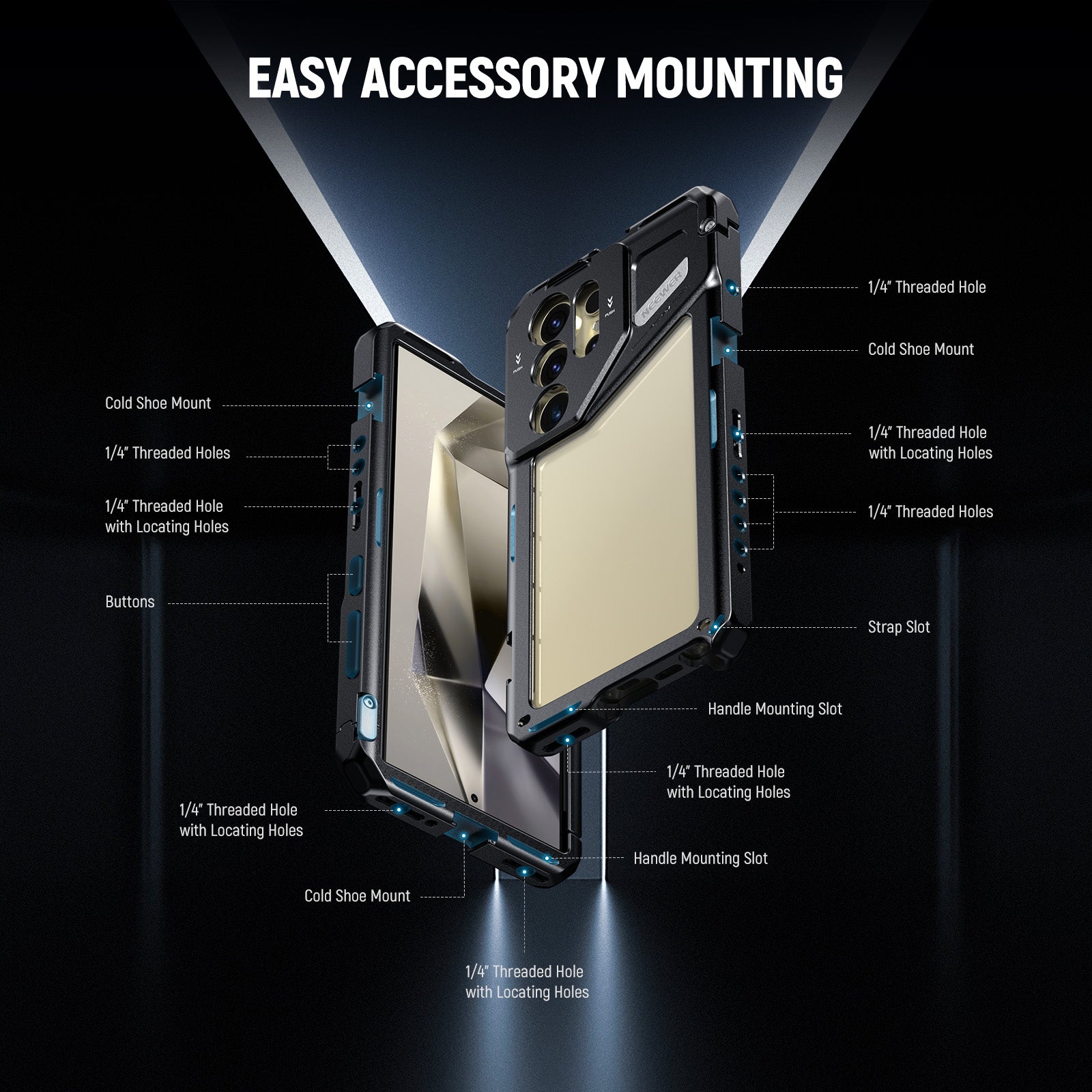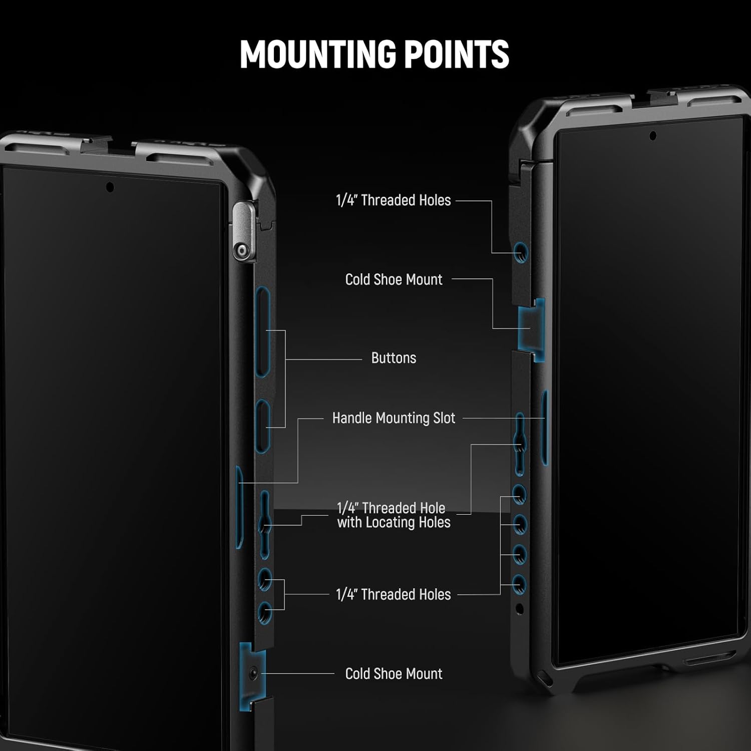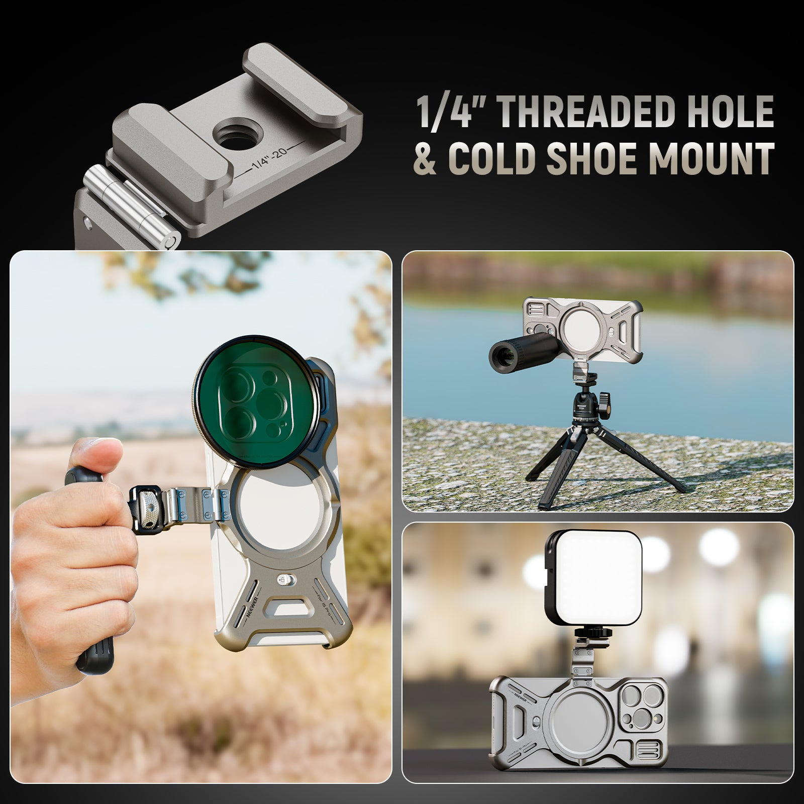 Étuis/cages pour téléphones dédiés et universels, poignées, commandes Bluetooth, chariots, sliders, trépieds et autres accessoires pour la photographie mobile.