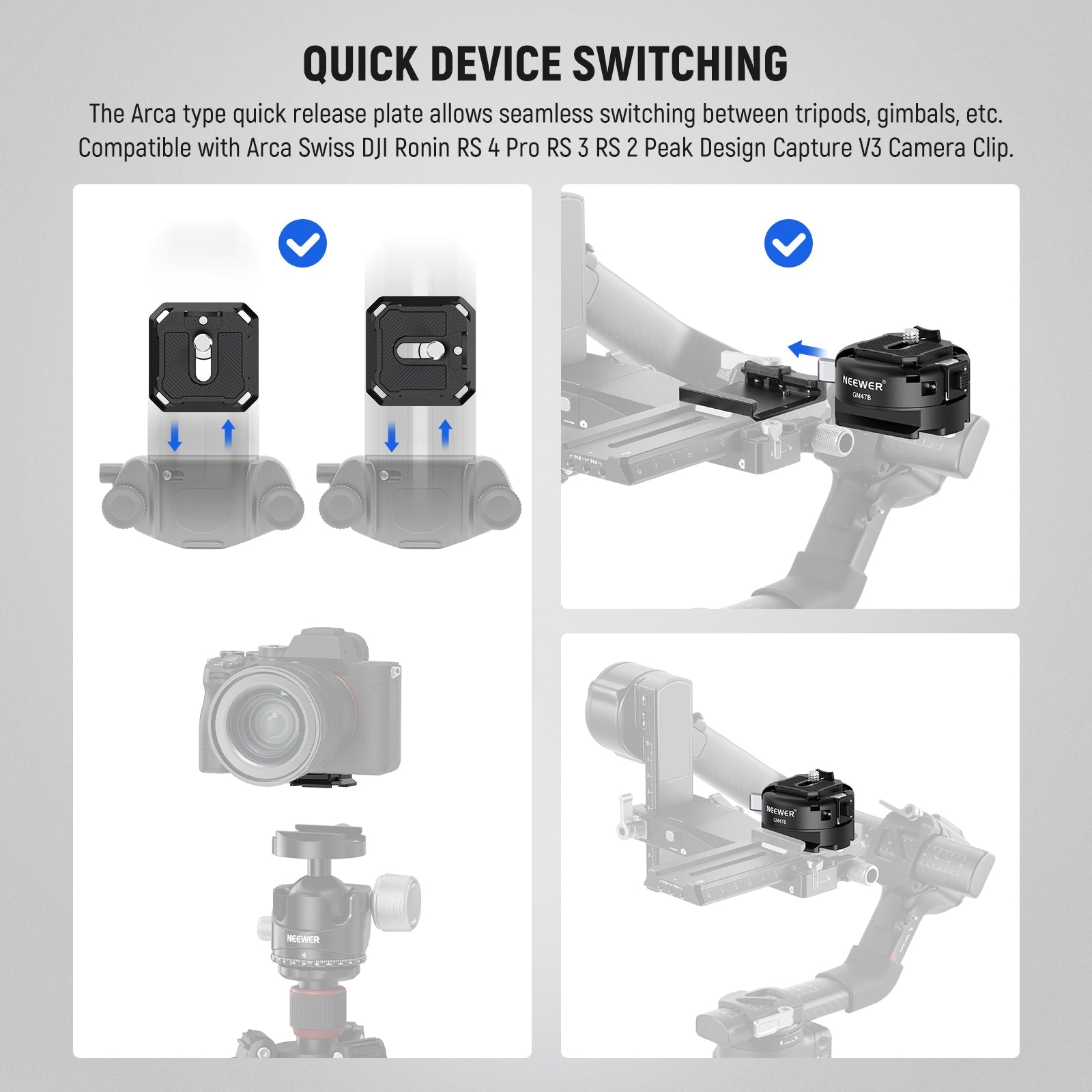 - Plaque de fixation rapide à triple compatibilité QR - Améliorée pour une compatibilité accrue avec les stabilisateurs de nacelle DJI RS 4/RS 4 Pro/RS 3/RS 3 Pro/RS 2/RS 2 Pro, cette plaque de fixation rapide de type Arca et sa base à pince sont également compatibles avec le support de sangle de sac à dos Peak Design Capture Camera Clip V3. Elle permet un changement d'appareil en une seconde grâce à un simple interrupteur. Elle peut également être montée sur des trépieds, des monopodes ou des sliders, facilitant ainsi la prise de vue sur trépied et à main levée.