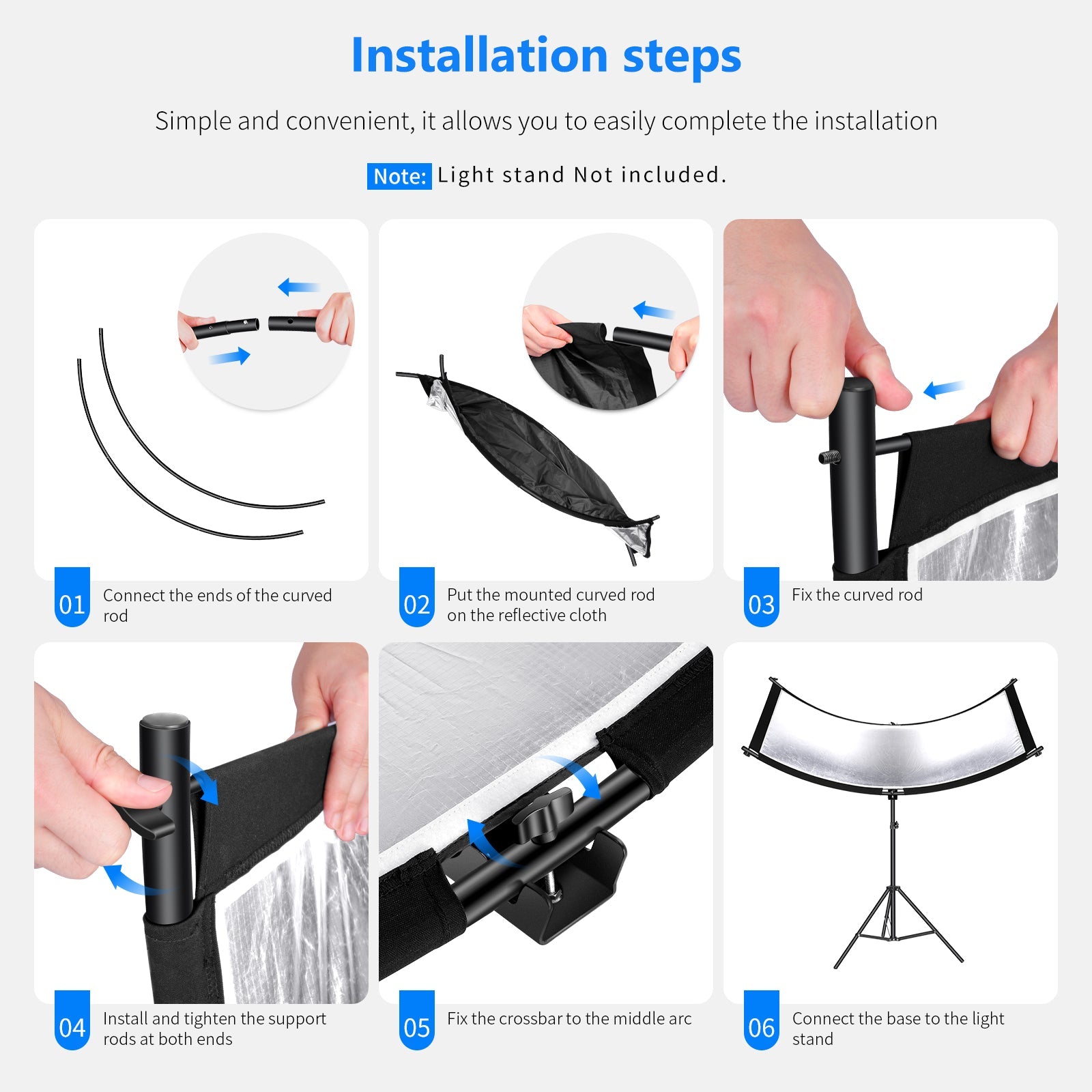 - Assemblage sans outil : six tubes incurvés emboîtables, deux tiges métalliques robustes et des molettes de serrage permettent d’assembler le cadre en quelques minutes sans aucun outil. Les tubes et les tiges incurvés se glissent facilement dans les fourreaux et tendent le réflecteur.