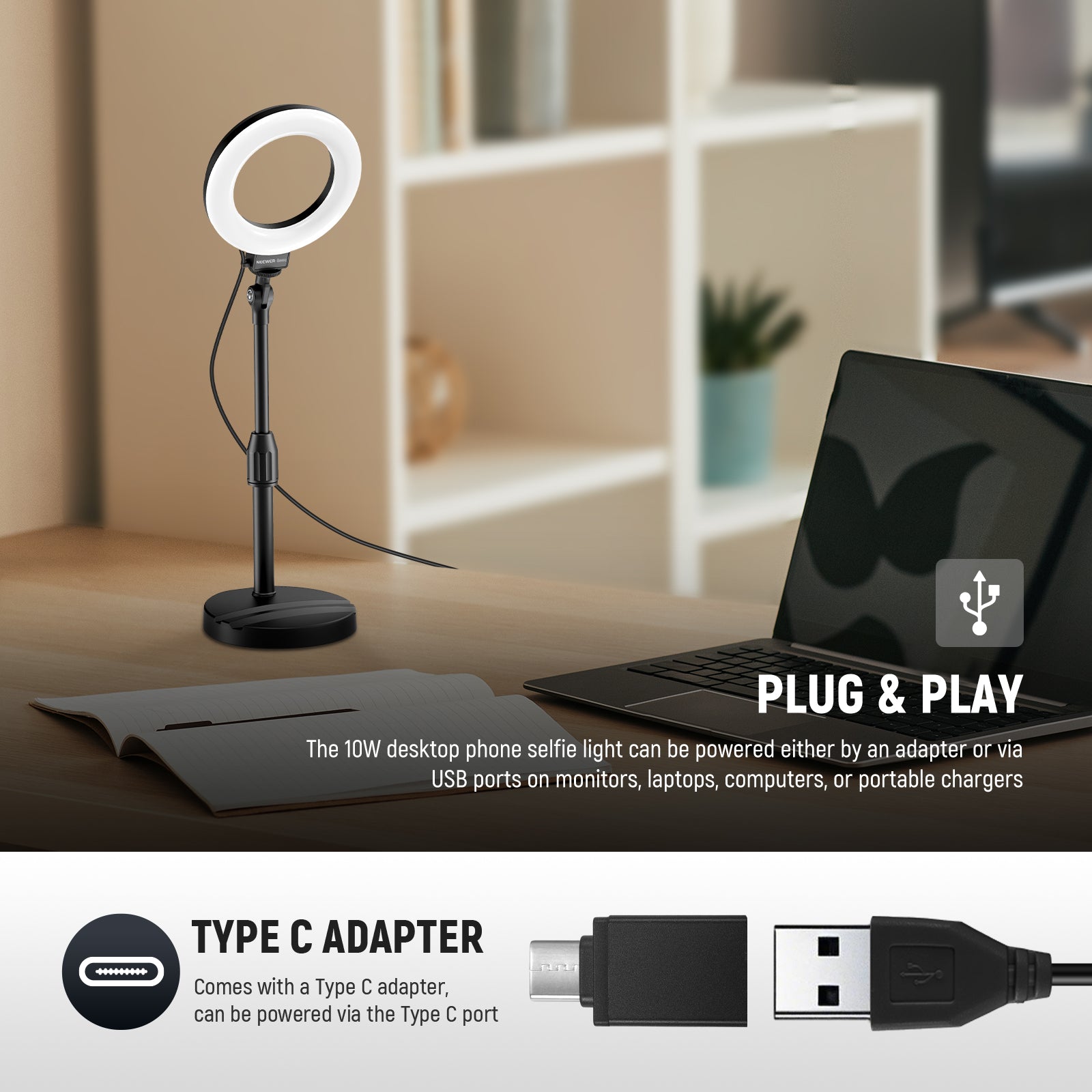 - Lampe selfie LED USB - Cette petite lampe annulaire LED professionnelle de bureau de 10 W fonctionne à 5 V/2 A et est équipée d'un câble de charge intégré de 1,8 m. Elle peut être alimentée facilement par des écrans, des ordinateurs portables, des chargeurs portables ou d'autres sources d'alimentation USB, offrant ainsi des solutions d'alimentation flexibles pour la photographie, la vidéographie et un éclairage continu au quotidien.