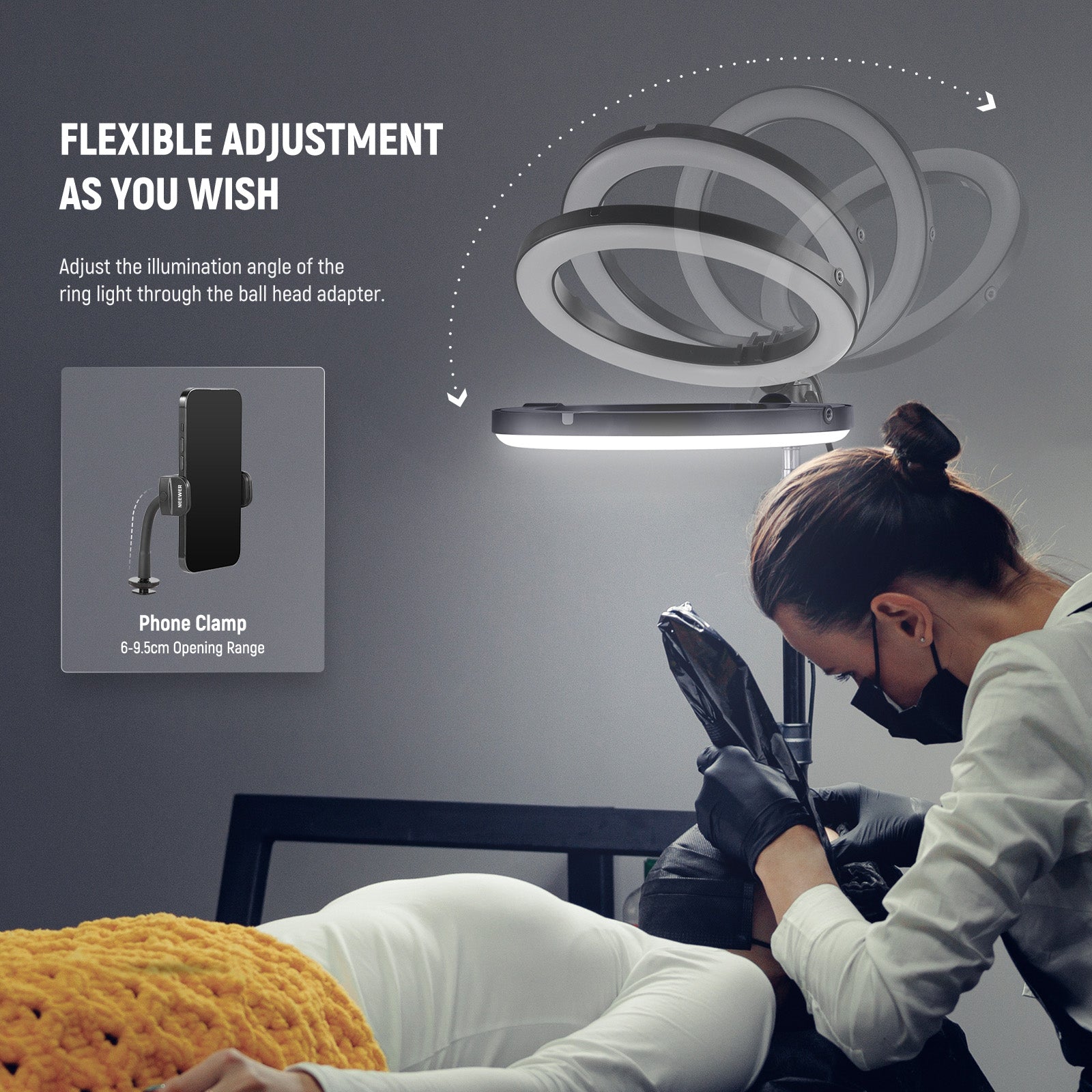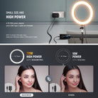 - Rotule à 360° et support griffe flash : le kit comprend une rotule à 360° avec vis 1/4" pour une fixation facile de l'anneau lumineux sur le trépied, permettant une rotation à 360° et une inclinaison à 90° pour des réglages d'angle flexibles. Le support griffe flash, quant à lui, maintient le support de téléphone flexible en place, assurant une grande polyvalence pour la photographie mobile.