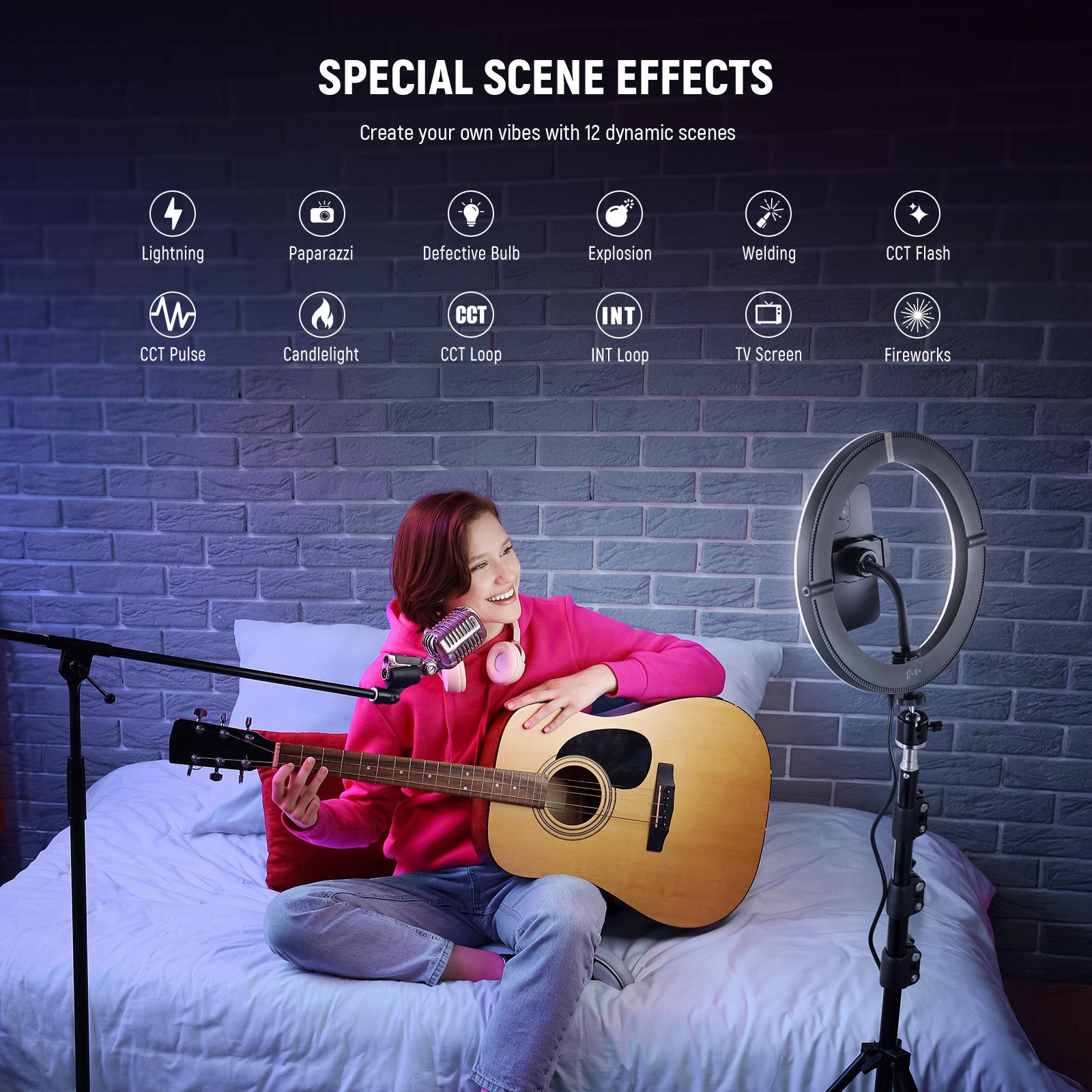 - Modes d'effets CCT et FX - Le mode CCT offre un éclairage chaud et froid de 2 900 K à 7 000 K, avec une gradation de 0 à 100 %. Cet éclairage ajustable flatte toutes les carnations, illumine le visage et atténue les imperfections. Le mode FX propose 12 effets réalistes pour des prises de vue vidéo professionnelles. Utilisez la télécommande filaire pour obtenir rapidement l'effet souhaité.